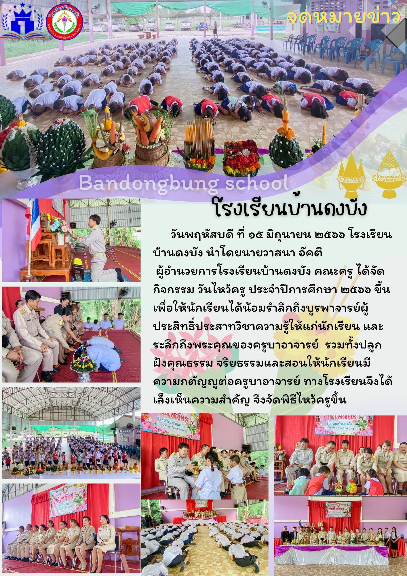 วันพฤหัสบดีที่ 15 มิถุนายน 2566 โรงเรียนบ้านดงบัง โดยการนำของ นายวาสนา อัคติ ผู้อำนวยการโรงเรียนบ้านดงบัง พร้อมด้วยคณะครูบุคลากรและนักเรียน ได้ร่วมจัดกิจกรรมวันไหว้ครู ประจำปี พ.ศ.2566