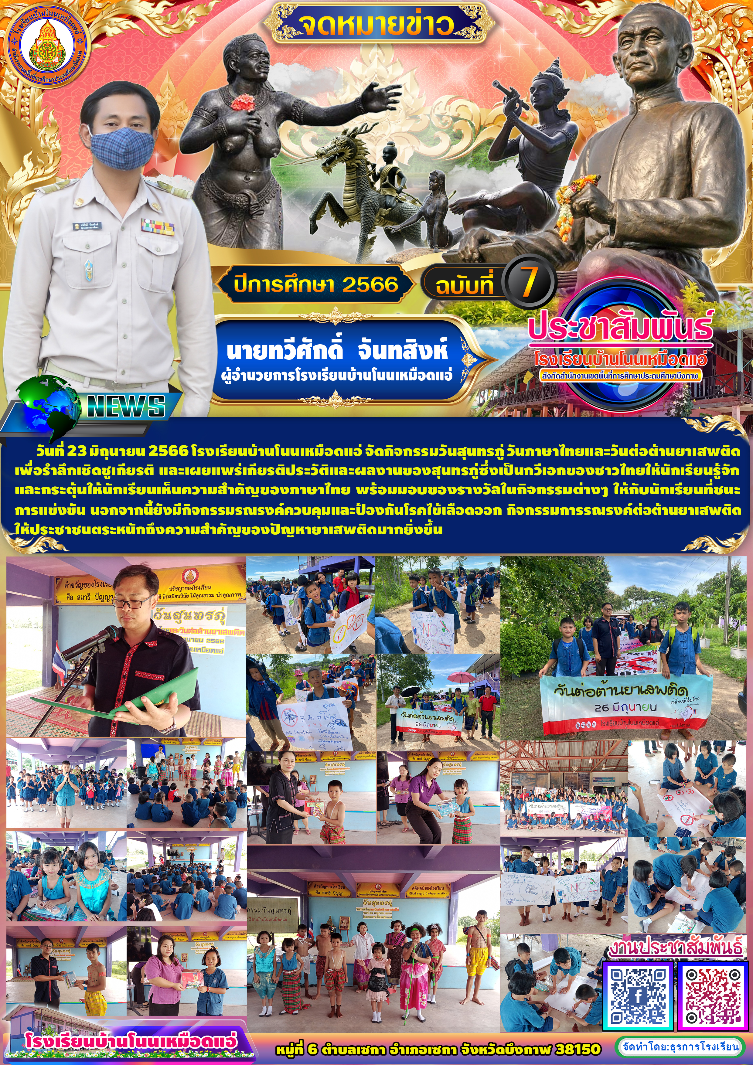 โรงเรียนบ้านโนนเหมือดแอ่ ขอประชาสัมพันธ์จดหมายข่าว ฉบับที่ 7 ปีการศึกษา 2566 กิจกรรมวันสุนทรภู่ วันภาษาไทย วันต่อต้านยาเสพติด และกิจกรรมรณรงค์ควบคุมและป้องกันโรคไข้เลือดออก