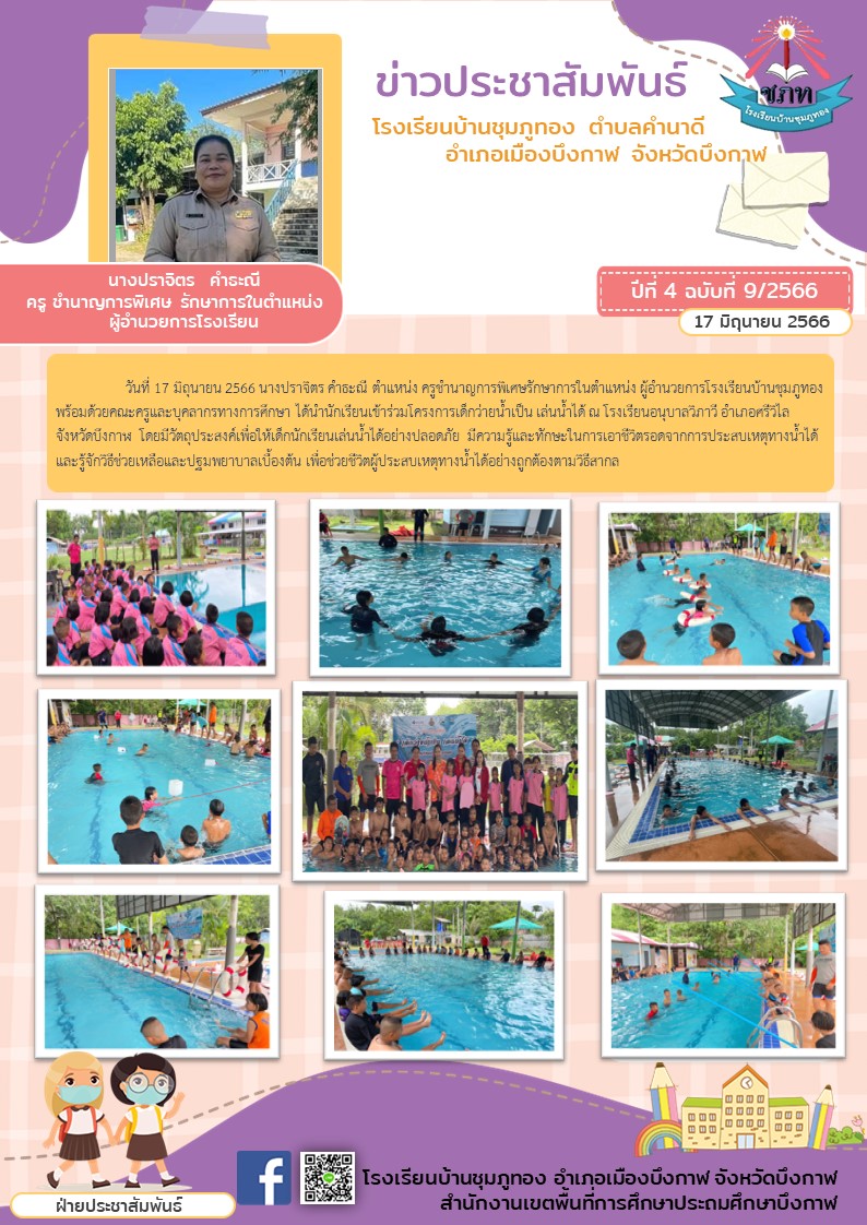 วันที่ 17 มิถุนายน 2566 นางปราจิตร คำธะณี ตำแหน่ง ครูชำนาญการพิเศษรักษาการในตำแหน่ง ผู้อำนวยการโรงเรียนบ้านชุมภูทอง พร้อมด้วยคณะครูและบุคลากรทางการศึกษา ได้นำนักเรียนเข้าร่วมโครงการเด็กว่ายน้ำเป็น เล่นน้ำได้ ณ โรงเรียนอนุบาลวิภาวี