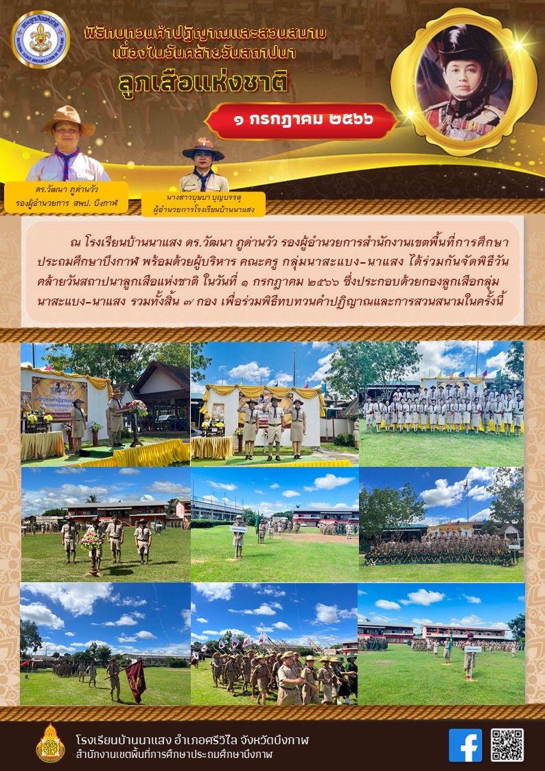 โรงเรียนบ้านนาแสง ร่วมกับโรงเรียนในกลุ่มนาสะแบง-นาแสง จัดกิจกรรมพิธีทบทวนคำปฏิญาณและสวนสนาม และบำเพ็ญประโยชน์ เนื่องในวันคล้ายวันสถาปนาคณะลูกเสือแห่งชาติ (1 กรกฎาคม ) ประจำปี 2566