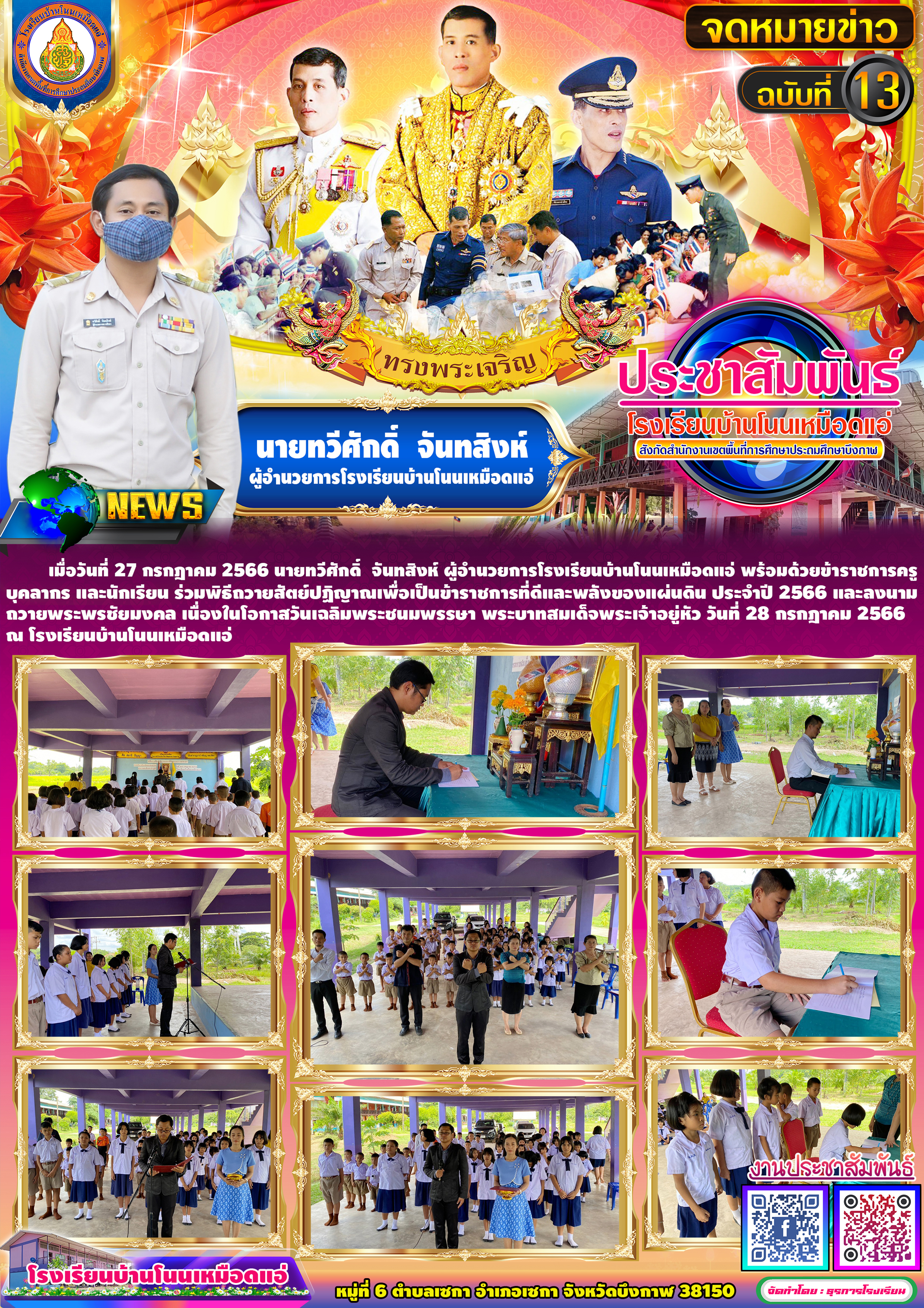 โรงเรียนบ้านโนนเหมือดแอ่ ขอประชาสัมพันธ์จดหมายข่าว ฉบับที่ 13 ปีการศึกษา 2566 พิธีถวายสัตย์ปฏิญาณ และพิธีลงนามถวายพระพร เนื่องในโอกาสวันเฉลิมพระชนมพรรษาพระบาทสมเด็จพระเจ้าอยู่หัว วันที่ 28 กรกฎาคม 2566