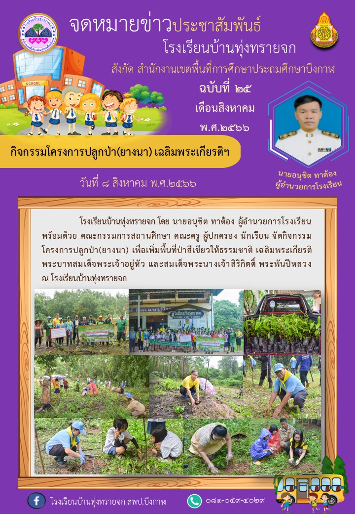 โรงเรียนบ้านทุ่งทรายจก ขอประชาสัมพันธ์ ฉบับที่ 25/2566 วันที่ 8 สิงหาคม 2566 จัดกิจกรรมโครงการปลูกป่า(ยางนา) เพื่อเพิ่มพื้นที่ป่าสีเขียวให้ธรรมชาติ เฉลิมพระเกียรติพระบาทสมเด็จพระเจ้าอยู่หัว และสมเด็จพระนางเจ้าสิริกิตติ์ พระพันปีหลวง