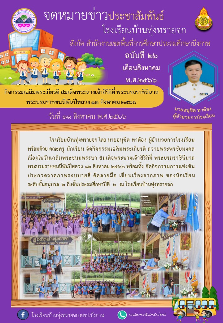 โรงเรียนบ้านทุ่งทรายจก ขอประชาสัมพันธ์ ฉบับที่ 26/2566 วันที่ 11 สิงหาคม 2566 กิจกรรมเฉลิมพระเกียรติ สมเด็จพระนางเจ้าสิริกิติ์ พระบรมราชินีนาถ พระบรมราชชนนีพันปีหลวง ๑๒ สิงหาคม ๒๕๖๖