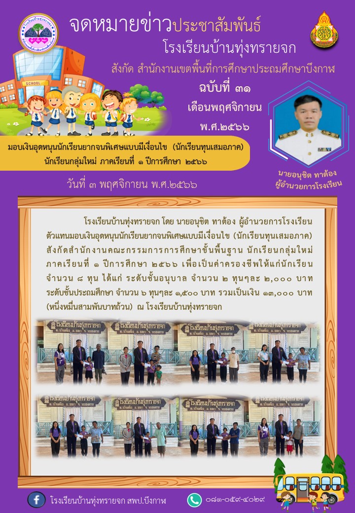 โรงเรียนบ้านทุ่งทรายจก ขอประชาสัมพันธ์จดหมายข่าว ฉบับที่ 31/2566 วันที่ 3 พฤศจิกายน พ.ศ.2566 มอบเงินอุดหนุนนักเรียนยากจนพิเศษแบบมีเงื่อนไข (นักเรียนทุนเสมอภาค) นักเรียนกลุ่มใหม่ ภาคเรียนที่ 1 ปีการศึกษา 2566