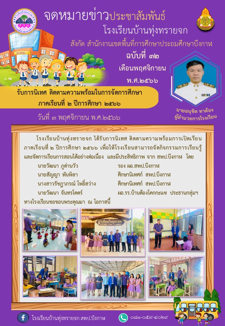 โรงเรียนบ้านทุ่งทรายจก ขอประชาสัมพันธ์จดหมายข่าว ฉบับที่ 32/2566 วันที่ 3 พฤศจิกายน พ.ศ.2566 รับการนิเทศ ติดตามความพร้อมในการจัดการศึกษา ภาคเรียนที่ 2 ปีการศึกษา 2566