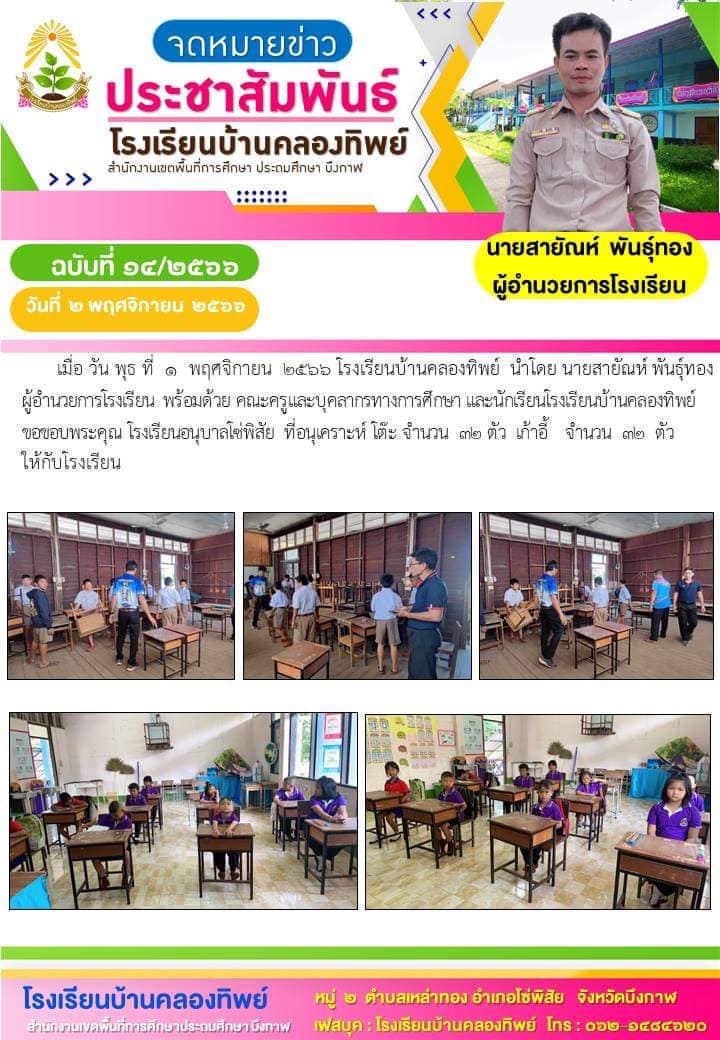 ได้รับความอนุเคราะห์โต้ะ เก้าอี้นักเรียน จำนวน 32 ชุด จากโรงเรียนอนุบาลโซ่พิสัย