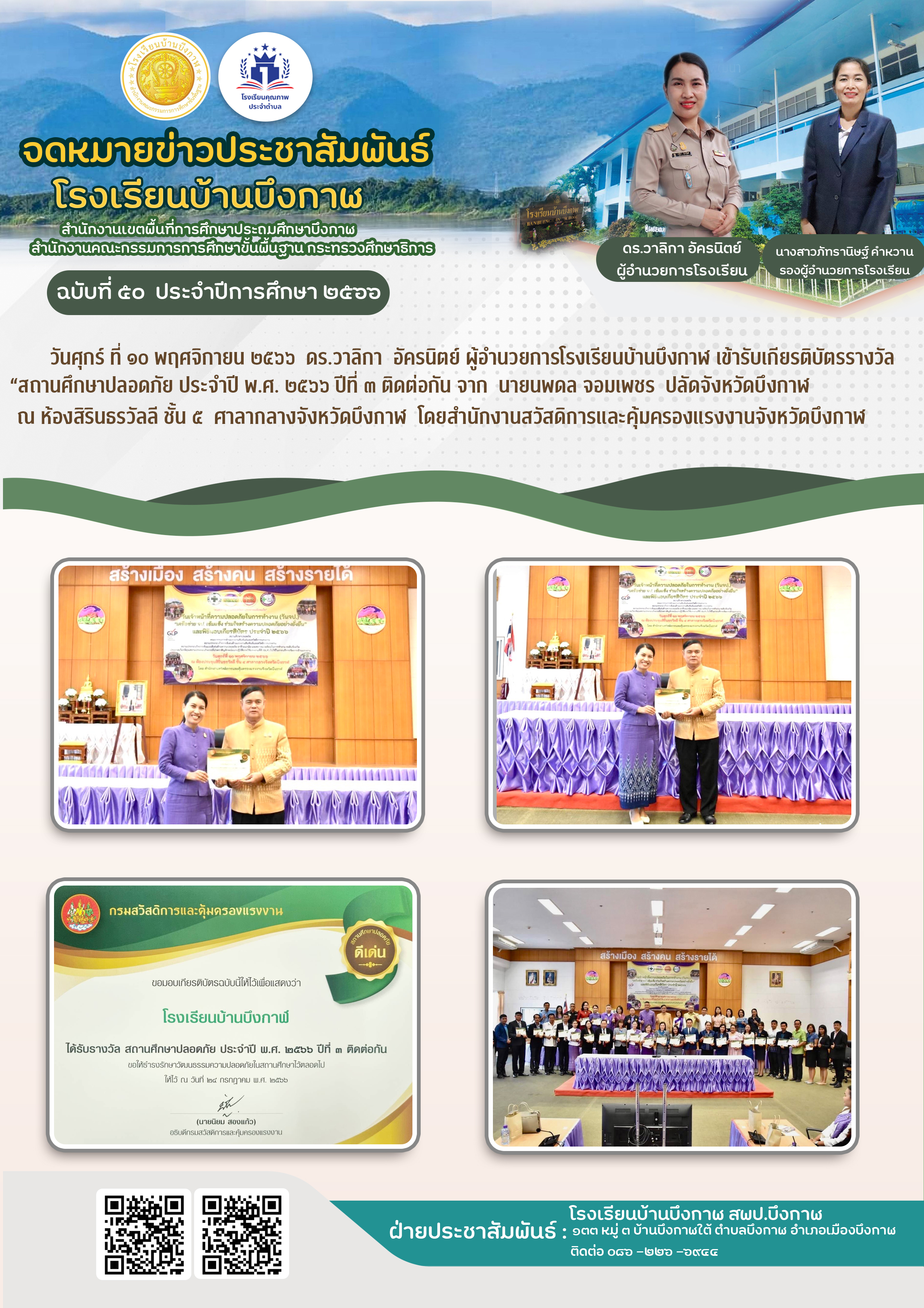 โรงเรียนบ้านบึงกาฬ ได้รับรางวัลสถานศึกษาปลอดภัย ประจำปี พ.ศ. 2566 ปีที่ 3 ติดต่อกัน