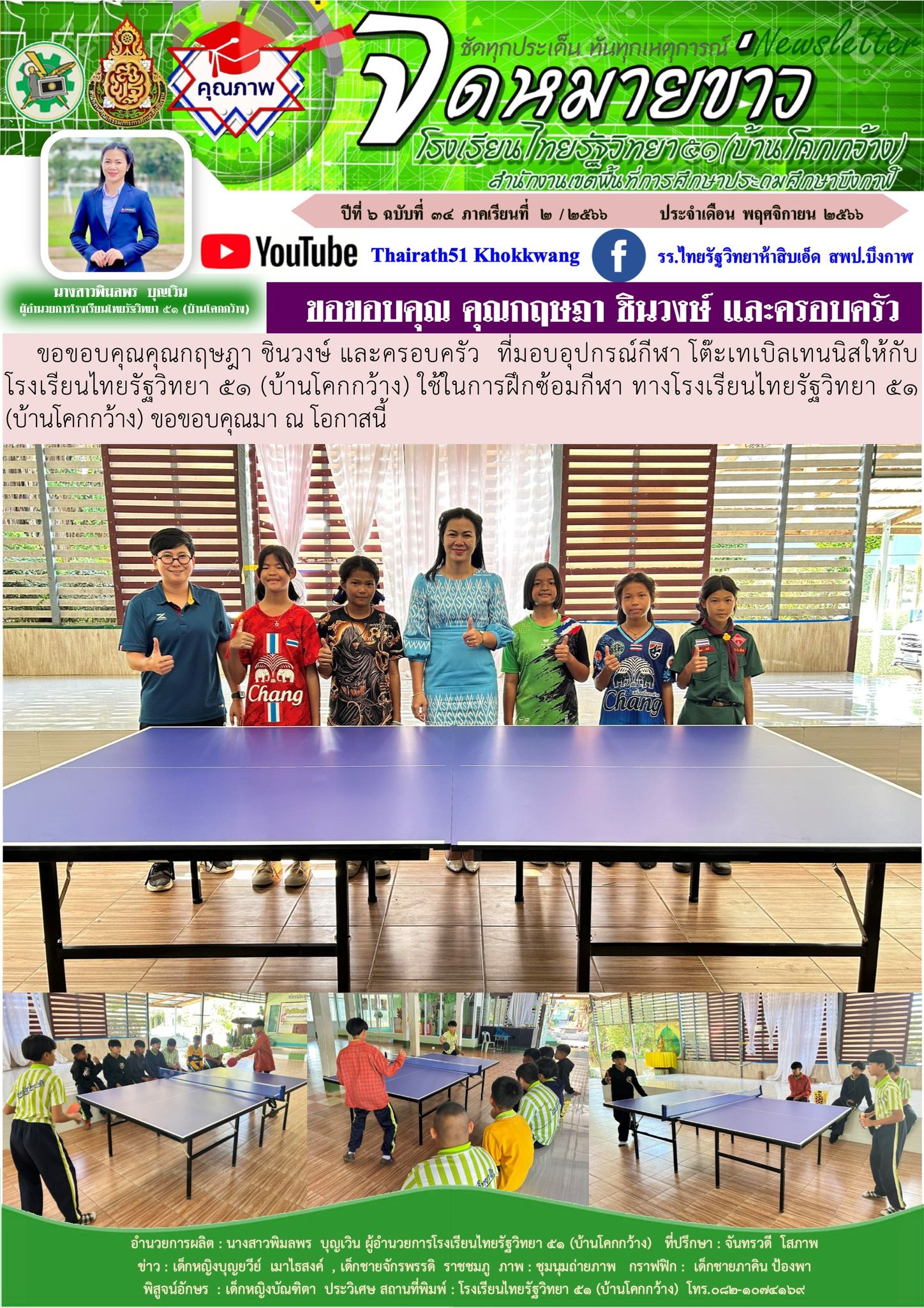 ผูัใหญ่ใจดี คุณคุณกฤษฎา ชินวงษ์ และครอบครัว ที่มอบอุปกรณ์กีฬา โต๊ะเทเบิลเทนนิสให้กับโรงเรียนไทยรัฐวิทยา ๕๑ (บ้านโคกกว้าง) ใช้ในการฝึกซ้อมกีฬา