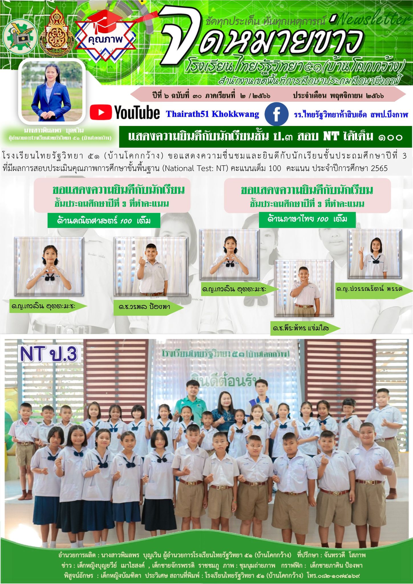 ขอแสดงความยินดีกับนักเรียนชั้น ป.3 คะแนนสอบ NT เต็ม 300