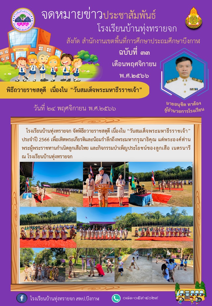 โรงเรียนบ้านทุ่งทรายจก ขอประชาสัมพันธ์จดหมายข่าว ฉบับที่ 33/2566 วันที่ 24 พฤศจิกายน พ.ศ.2566 พิธีถวายราชสดุดี เนื่องใน “วันสมเด็จพระมหาธีรราชเจ้า”