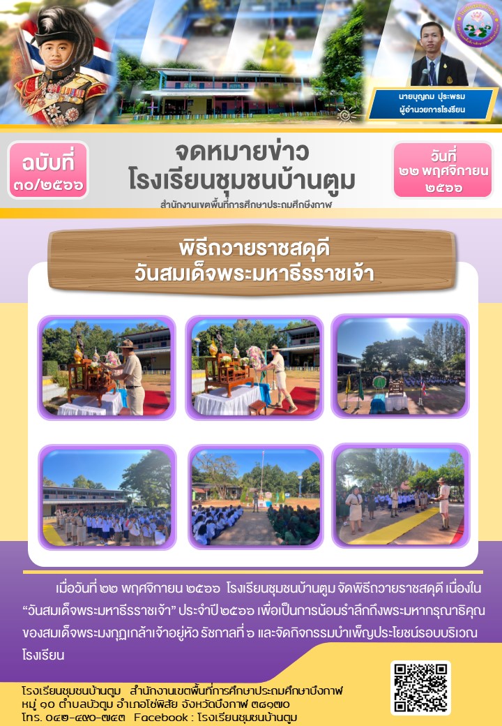 จดหมายข่าวประชาสัมพันธ์ โรงเรียนชุมชนบ้านตูม ฉบับที่ ๓๐ ประจำเดือน พฤศจิกายน พุทธศักราช ๒๕๖๖ "พิธีถวายราชสดุดี วันสมเด็จพระมหาธีรราชเจ้า"