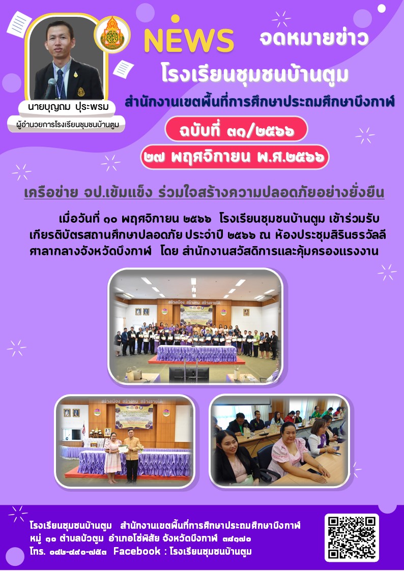โรงเรียนชุมชนบ้านตูม เข้าร่วมรับเกียรติบัตรสถานศึกษาปลอดภัย ประจำปี ๒๕๖๖ ณ ห้องประชุมสิรินธรวัลลี ศาลากลางจังหวัดบึงกาฬ โดย สำนักงานสวัสดิการและคุ้มครองแรงงาน