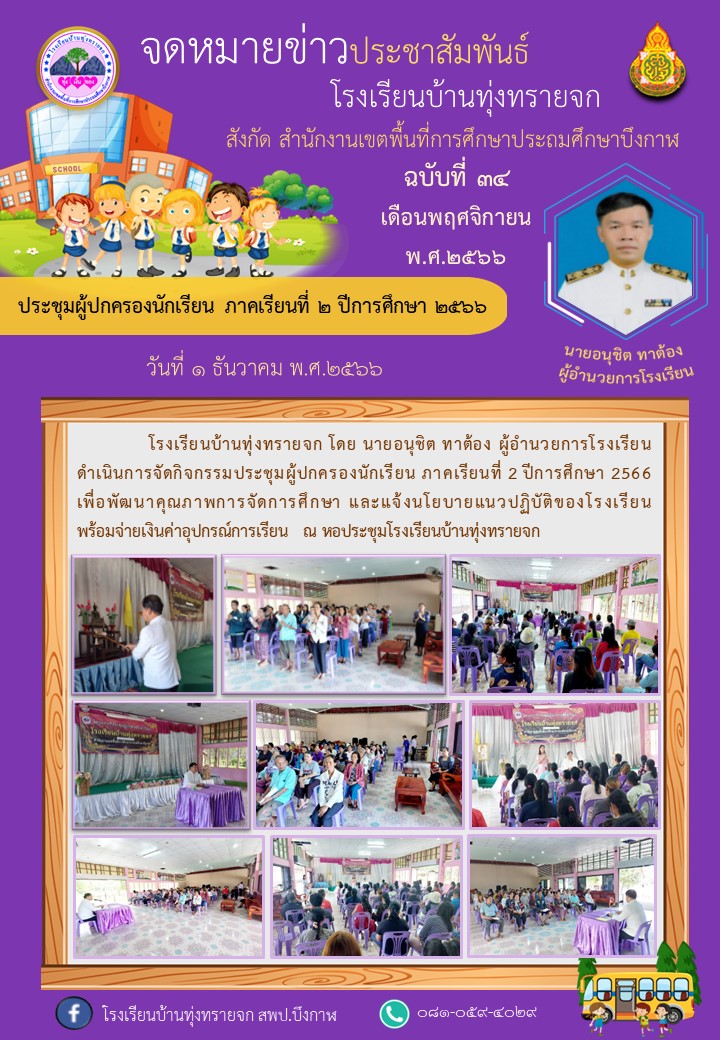 โรงเรียนบ้านทุ่งทรายจก ขอประชาสัมพันธ์จดหมายข่าว ฉบับที่ 34/2566 วันที่ 1 ธันวาคม พ.ศ.2566 จัดกิจกรรมประชุมผู้ปกครองนักเรียน ภาคเรียนที่ 2 ปีการศึกษา 2566
