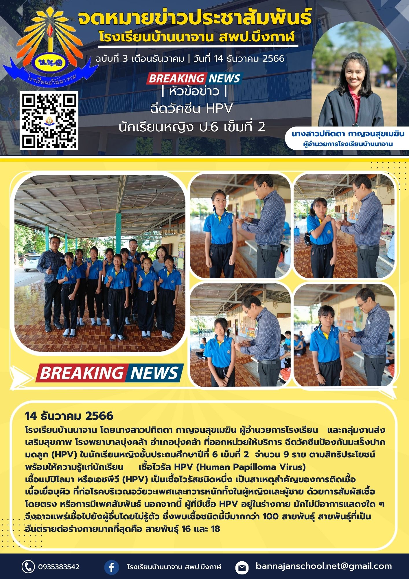 โรงเรียนบ้านนาจาน รับการฉีดวัคซีน HPV นักเรียนหญิง ป.6 เข็มที่ 2
