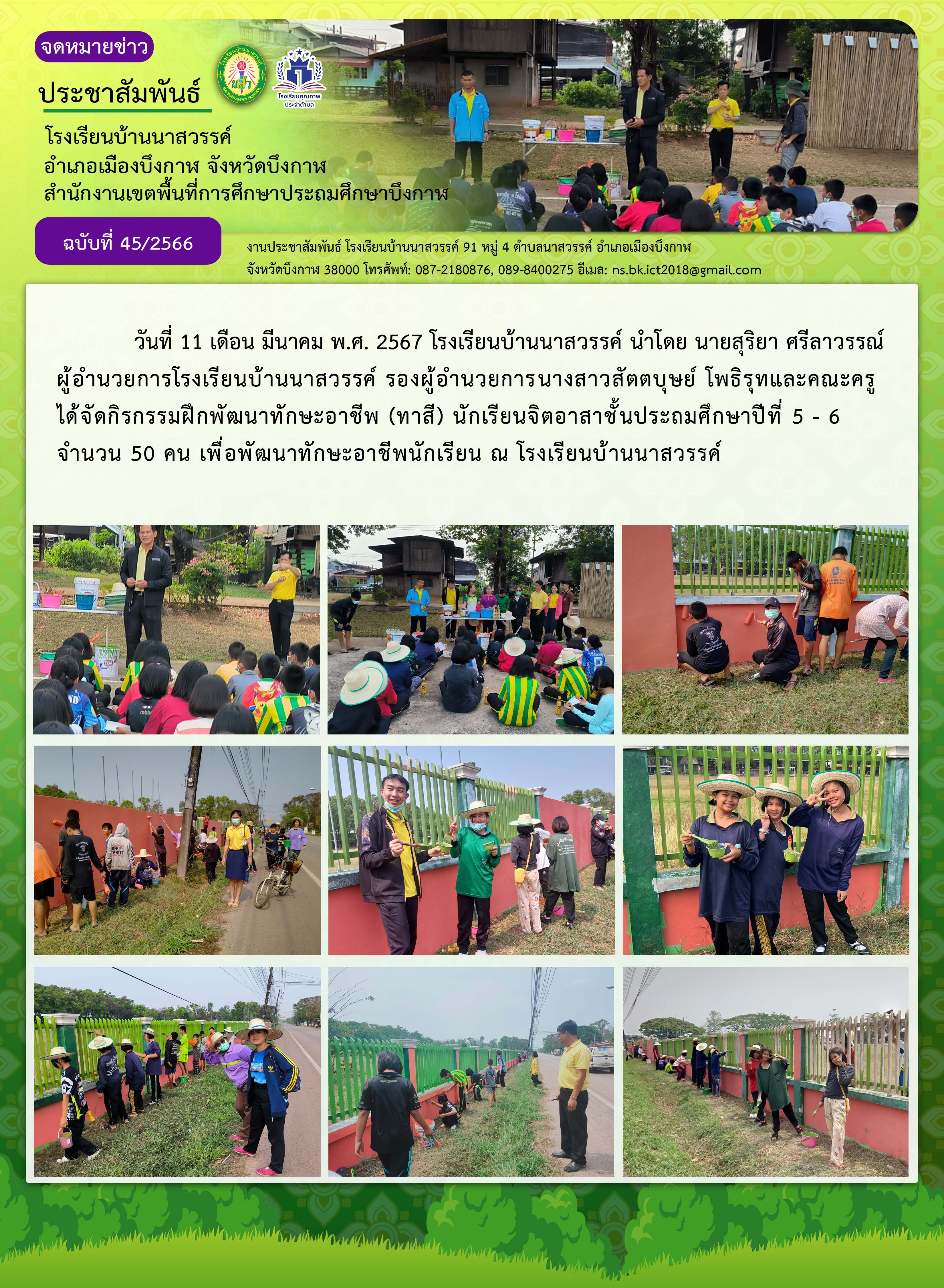 วันที่ 11 เดือน มีนาคม พ.ศ. 2567 โรงเรียนบ้านนาสวรรค์ นำโดย นายสุริยา ศรีลาวรรณ์ ผู้อำนวยการโรงเรียนบ้านนาสวรรค์ รองผู้อำนวยการนางสาวสัตตบุษย์ โพธิรุทและคณะครู ได้จัดกิรกรรมฝึกพัฒนาทักษะอาชีพ (ทาสี) นักเรียนจิตอาสาชั้นประถมศึกษาปีที่ 5 - 6 จำนวน 5