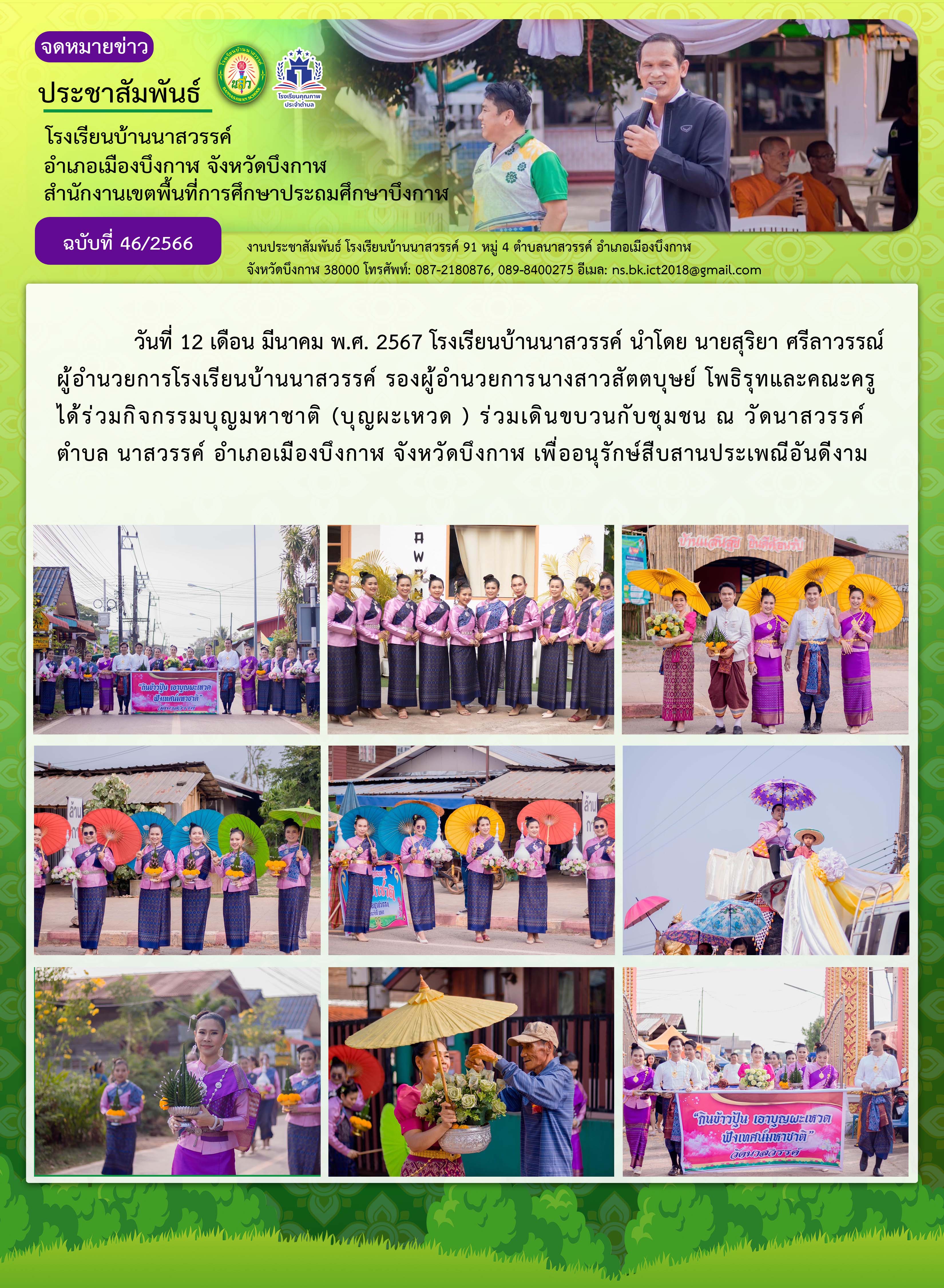 วันที่ 12 เดือน มีนาคม พ.ศ. 2567 โรงเรียนบ้านนาสวรรค์ นำโดย นายสุริยา ศรีลาวรรณ์ ผู้อำนวยการโรงเรียนบ้านนาสวรรค์ รองผู้อำนวยการนางสาวสัตตบุษย์ โพธิรุทและคณะครู ได้ร่วมกิจกรรมบุญมหาชาติ (บุญผะเหวด ) ร่วมเดินขบวนกับชุมชน ณ วัดนาสวรรค์ ตำบล นาสวรรค์