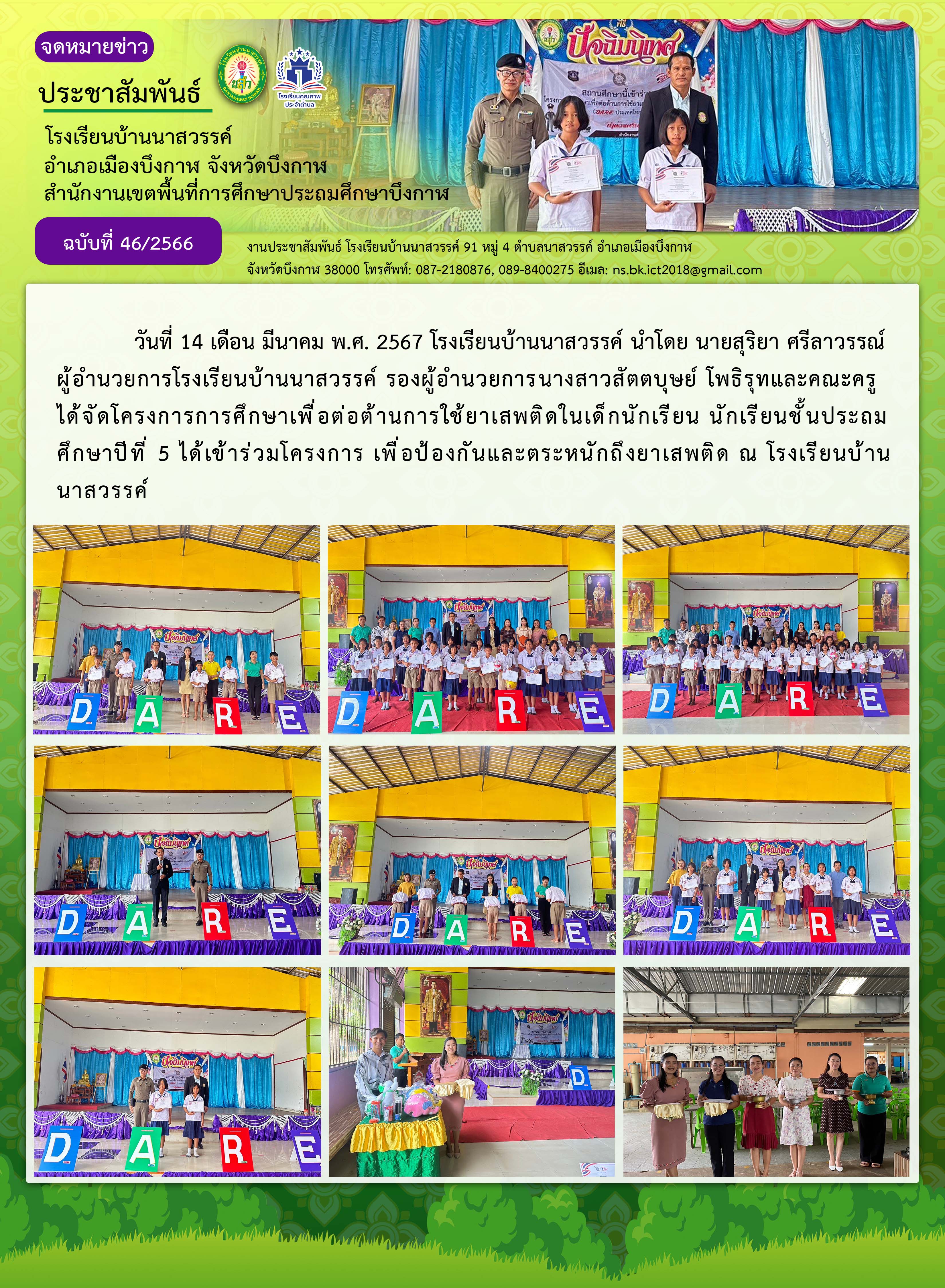วันที่ 14 เดือน มีนาคม พ.ศ. 2567 โรงเรียนบ้านนาสวรรค์ นำโดย นายสุริยา ศรีลาวรรณ์ ผู้อำนวยการโรงเรียนบ้านนาสวรรค์ รองผู้อำนวยการนางสาวสัตตบุษย์ โพธิรุทและคณะครู ได้จัดโครงการการศึกษาเพื่ อต่อต้านการใช้ยาเสพติดในเด็กนักเรียน นักเรียนชั้นประถม ศึกษาป