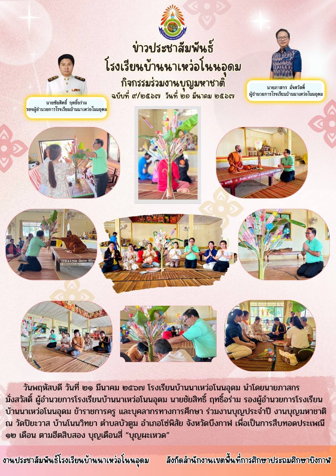 ประชาสัมพันธ์จดหมายข่าวโรงเรียนบ้านนาเหว่อโนนอุดม ฉบับที่ ๙/๒๕๖๗ ลงวันที่ ๒๑ มีนาคม ๒๕๖๗ กิจกรรมร่วมานบุญมหาชาติในชุมชน