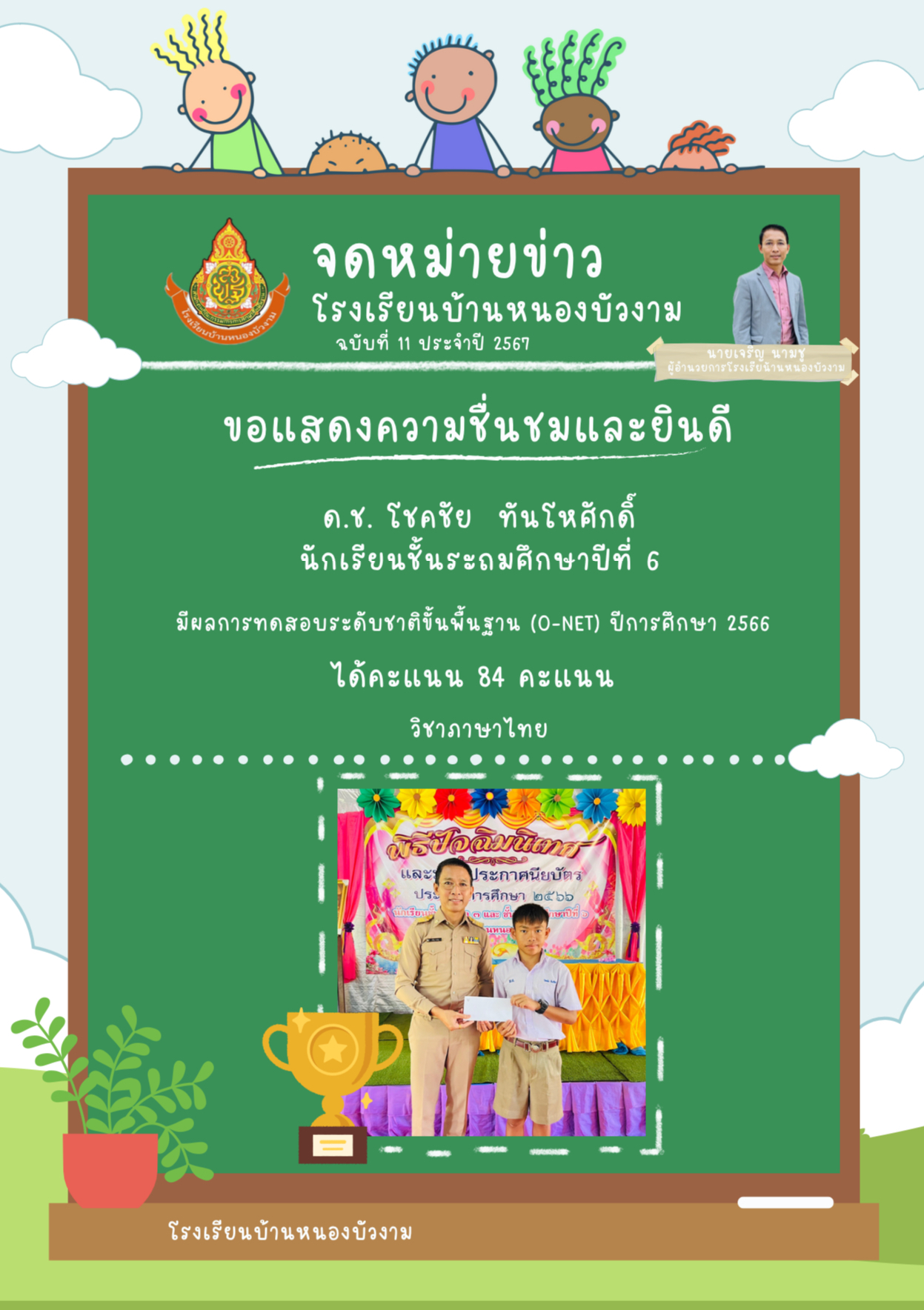 จดหมายข่าวโรงเรียนบ้านหนองบัวงาม ฉบับที่ 11/2567 แสดงความชื่มชมและยินดีกับนักเรียน ที่มีผลการทดสอบ O-NET ได้คะแนน 84 คะแนน วิชาภาษาไทย