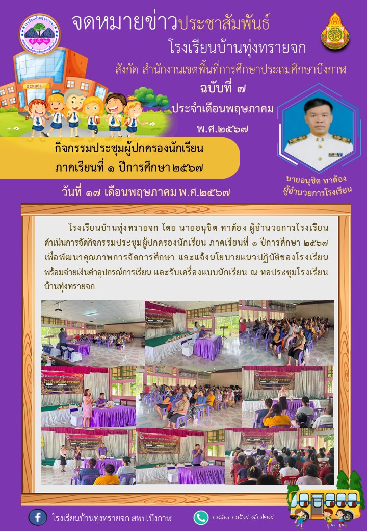 โรงเรียนบ้านทุ่งทรายจก ขอประชาสัมพันธ์จดหมายข่าว ฉบับที่ 7/2567 วันที่ 17 พฤษภาคม พ.ศ.2567 จัดกิจกรรมประชุมผู้ปกครองนักเรียน ภาคเรียนที่ ๑ ปีการศึกษา ๒๕๖๗
