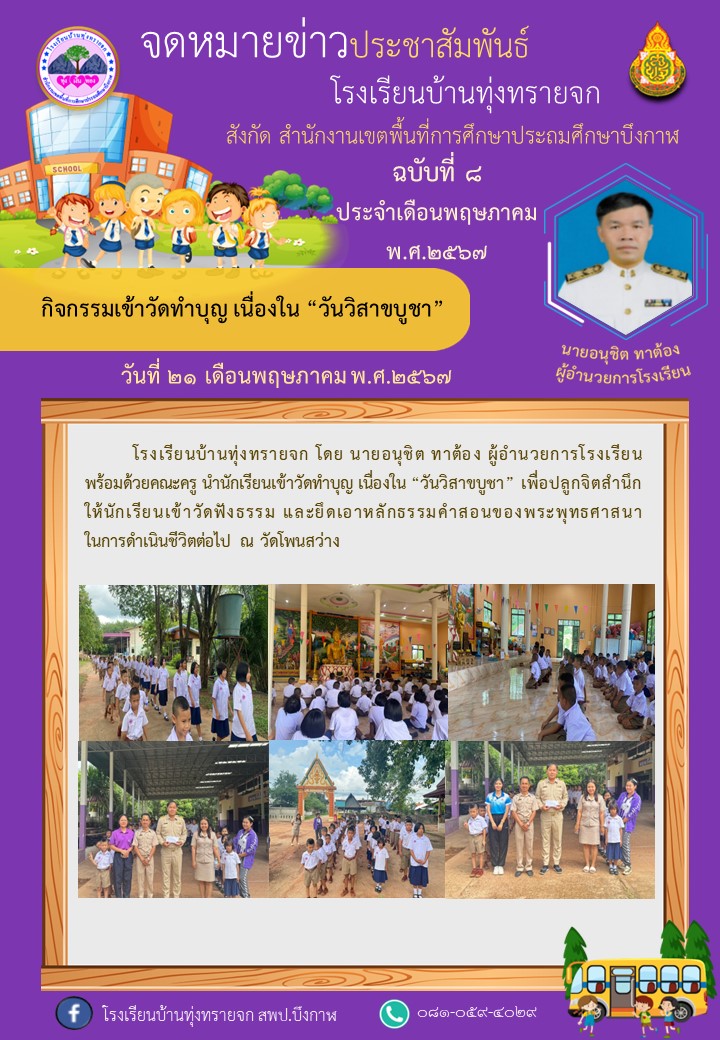 โรงเรียนบ้านทุ่งทรายจก ขอประชาสัมพันธ์จดหมายข่าว ฉบับที่ 8/2567 วันที่ 21 พฤษภาคม พ.ศ.2567 กิจกรรมเข้าวัดทำบุญ เนื่องใน “วันวิสาขบูชา”