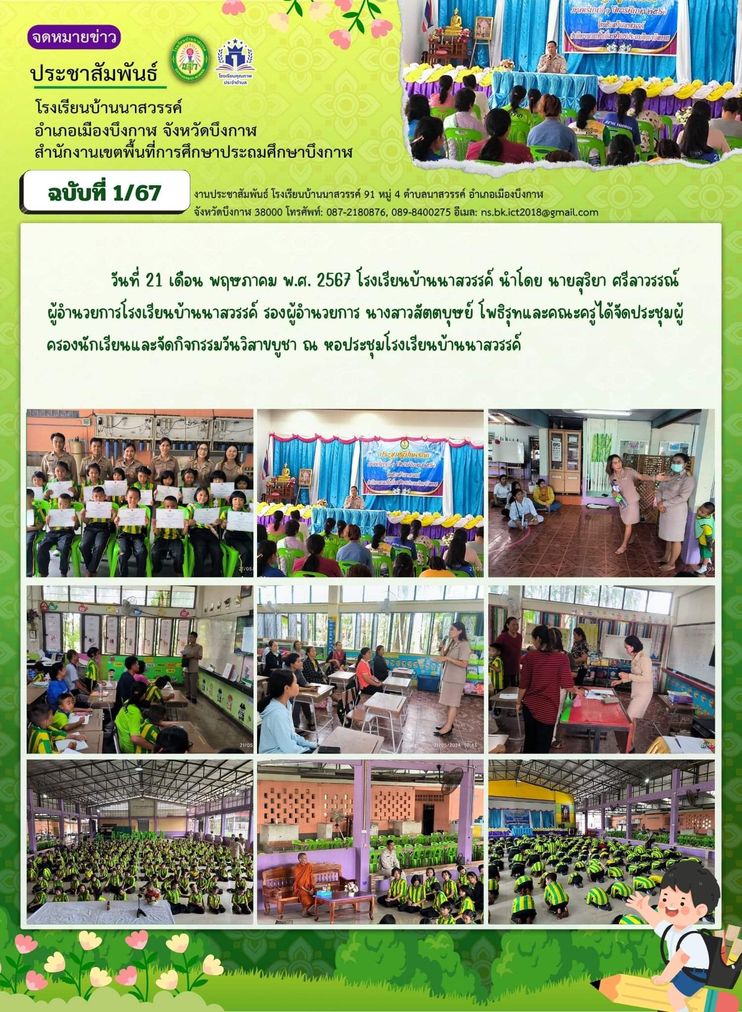 การประชุมผู้ปกครองนักเรียนภาคเรียนที่ 1/2567 วันที่ 21 พฤษภาคม 2567 โรงเรียนบ้านนาสวรรค์ พร้อมรับเงินสนับสนุน ค่าเครื่องแบบและค่าอุปกรณ์การเรียนฯ และกาาจัดกิจกรรมเนื่องในวันสำคัญทางพระพุทธศาสนา วันวิสาขบูชา ในวันเดียวกัน
