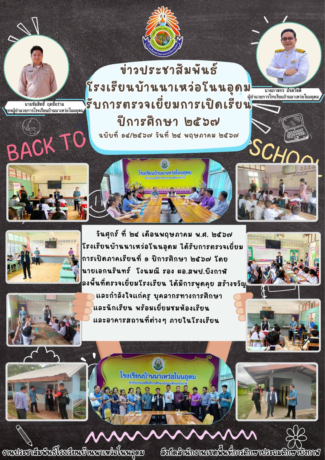 โรงเรียนบ้านนาเหว่อโนนอุดม ฉบับที่ 14 ลงวันที่ 24 พฤษภาคม 2567 กิจกรรม ตรวจเยี่ยม/นิเทศ การเปิดภาคเรียนที่ 1ปีการศ฿กษา 2567 โดยท่านรองเอกรินทร์ โงนมณี พร้อมด้วยเจ้าหน้าที่สพป.บึงกาฬ