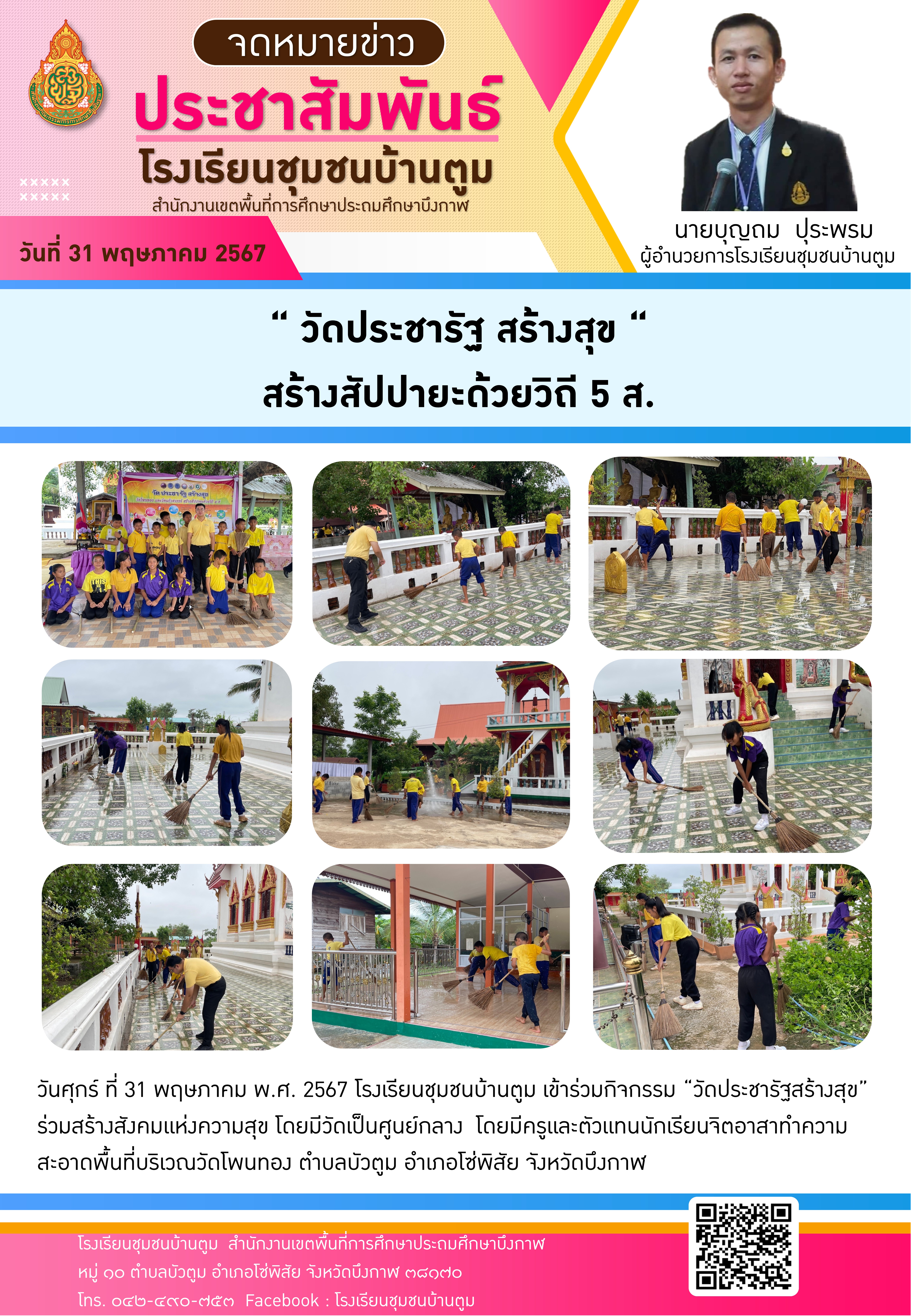 โรงเรียนชุมชนบ้านตูม เข้าร่วมกิจกรรม “วัดประชารัฐสร้างสุข” ร่วมสร้างสังคมแห่งความสุข โดยมีวัดเป็นศูนย์กลาง ณ วัดโพนทอง ตำบลบัวตูม อำเภอโซ่พิสัย จังหวัดบึงกาฬ