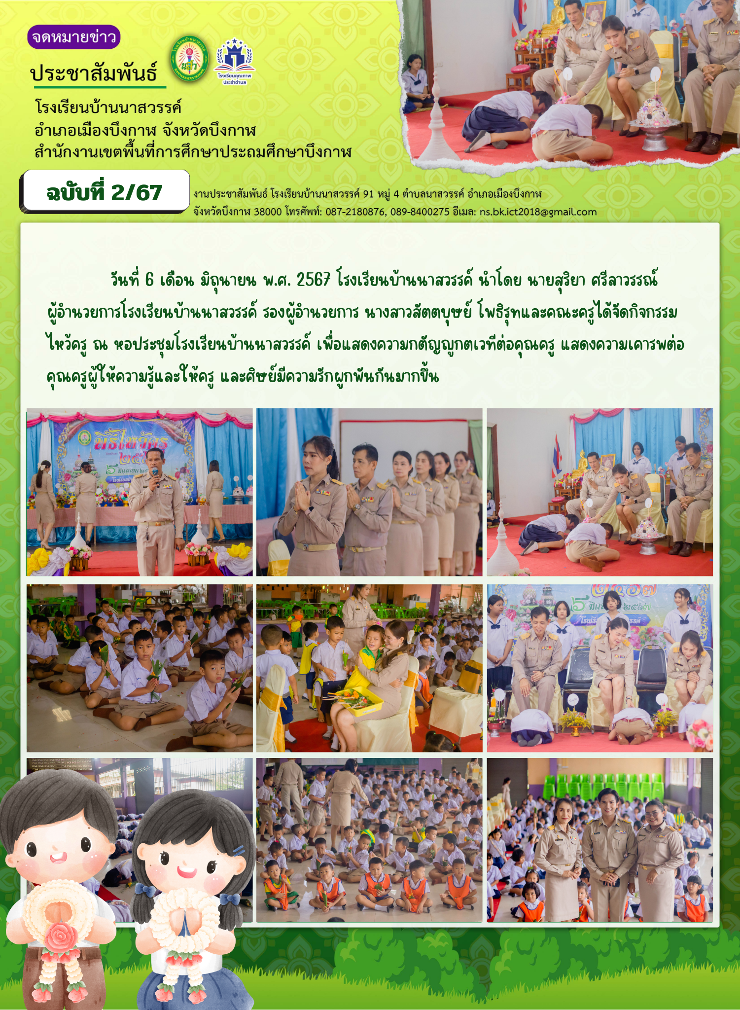 วันที่ 6 เดือน มิถุนายน พ.ศ. 2567 โรงเรียนบ้านนาสวรรค์ นำโดย นายสุริยา ศรีลาวรรณ์ผู้อำนวยการโรงเรียนบ้านนาสวรรค์ นางสาวสัตตบุษย์ โพธิรุท รองผู้อำนวยการโรงเรียนและคณะครู ได้จัดกิจกรรมไหว้ครู ณ หอประชุมโรงเรียนบ้านนาสวรรค์ เพื่อแสดงความกตัญญูกตเวทีต่อ