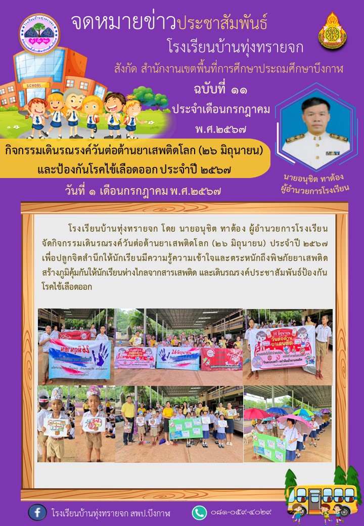 โรงเรียนบ้านทุ่งทรายจก ขอประชาสัมพันธ์จดหมายข่าว ฉบับที่ 11/2567 วันที่ 1 กรกฎาคม พ.ศ.2567 กิจกรรมเดินรณรงค์วันต่อต้านยาเสพติดโลก (26 มิถุนายน) และป้องกันโรคไข้เลือดออก ประจำปี 2567
