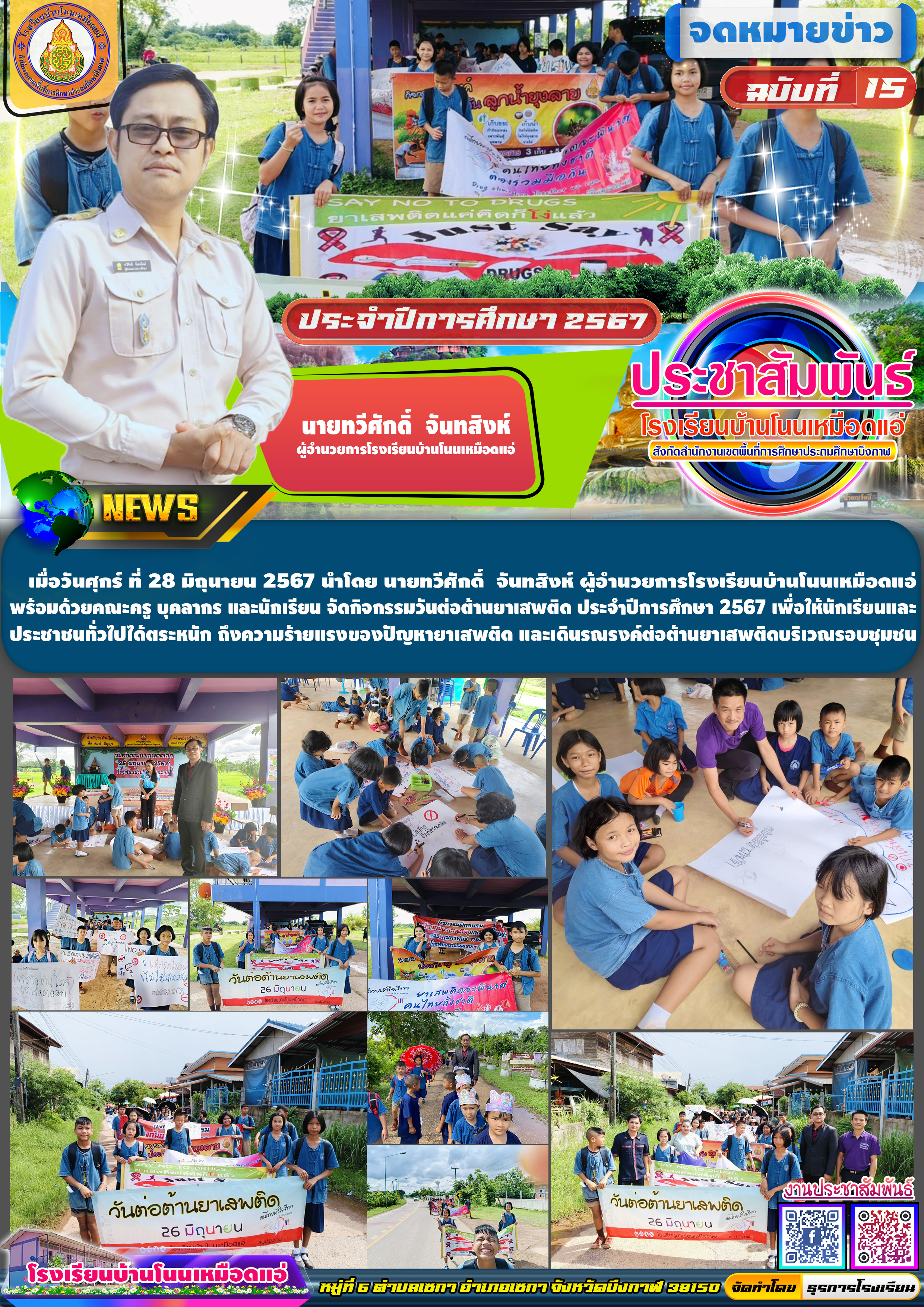 โรงเรียนบ้านโนนเหมือดแอ่ ขอประชาสัมพันธ์จดหมายข่าว ฉบับที่ 15 ปีการศึกษา 2567 กิจกรรมวันต่อต้านยาเสพติด ประจำปีการศึกษา 2567