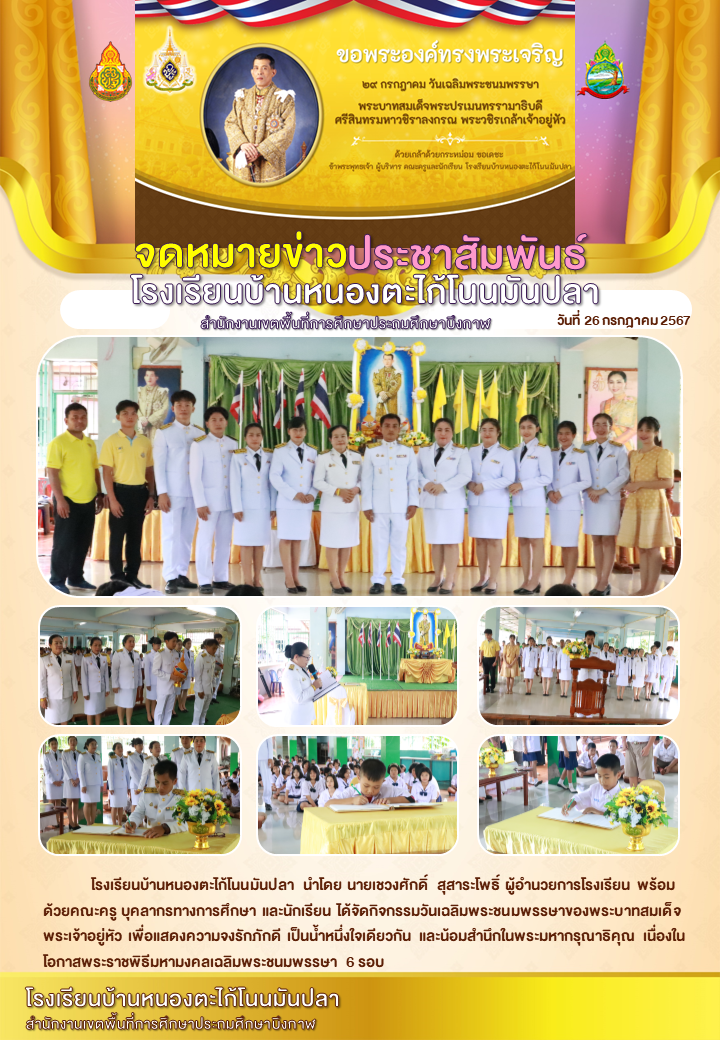 โรงเรียนบ้านโนนเหมือดแอ่ ขอประชาสัมพันธ์จดหมายข่าว ฉบับที่ 21 ปีการศึกษา 2567 พิธีลงนามถวายพระพรชัยมงคลพระบาทสมเด็จพระเจ้าอยู่หัว เนื่องในโอกาสพระราชพิธีมหามงคลเฉลิมพระชนมพรรษา 6 รอบ 28 กรกฎาคม 2567