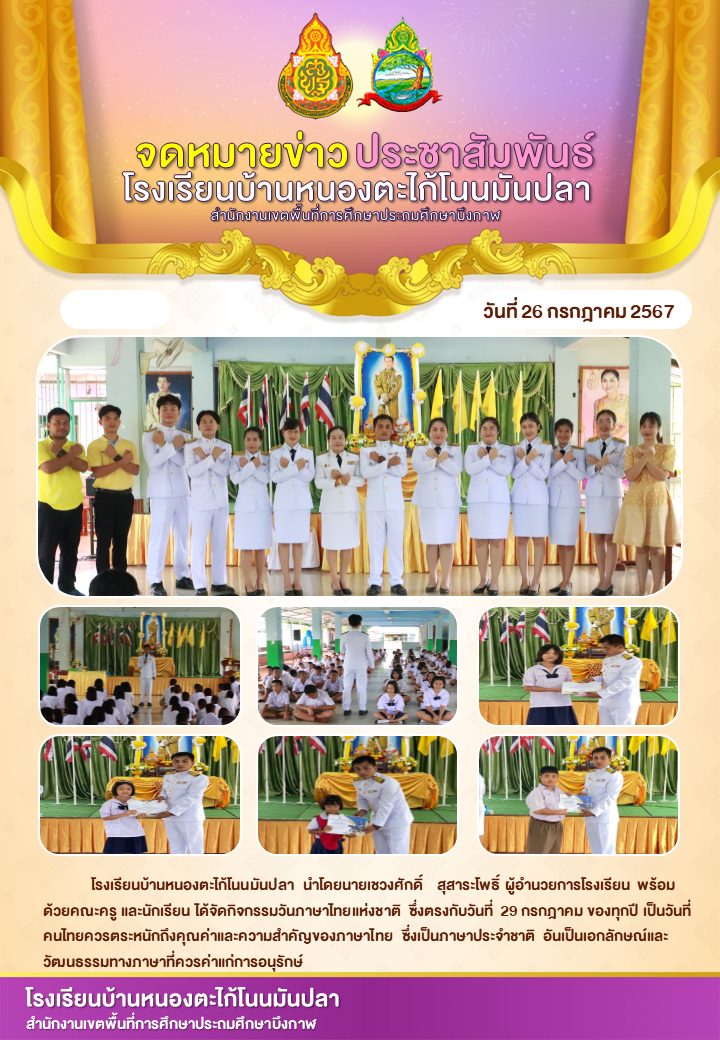 ข่าวประชาสัมพันธ์ โรงเรียนบ้านหนองตะไก้โนนมันปลา นำโดยนายเชวงศักดิ์ สุสาระโพธิ์ ผู้อำนวยการโรงเรียน พร้อมด้วยคณะครู และนักเรียน ได้จัดกิจกรรมวันภาษาไทยแห่งชาติ ซึ่งตรงกับวันที่ 29 กรกฎาคม ของทุกปี เป็นวันที่คนไทยควรตระหนักถึงคุณค่าและความส