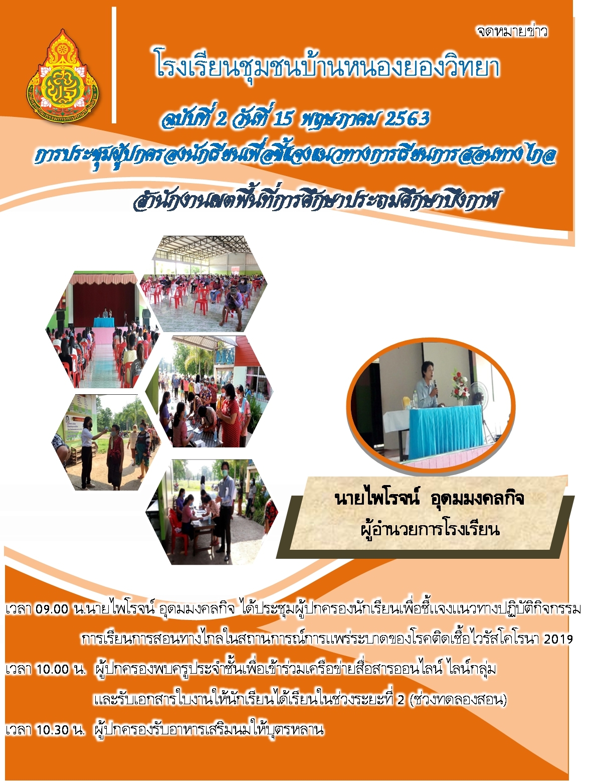 ประชุมแนวทางการจัดการเรียนการสอนทางไกล ในระยะที่ 2 (ระยะทดลองสอน) ร.ร.ชุมชนบ้านหนองยองวิทยา โดยปฏิบัติตามมาตราการป้องกันการแพร่ระบาด COVID 19 ( สวมผ้าปิดจมูก วัดอุณหภูมิ ล้างมือด้วยเจล และรักษาระยะห่าง อย่างน้อย 1 เมตร)