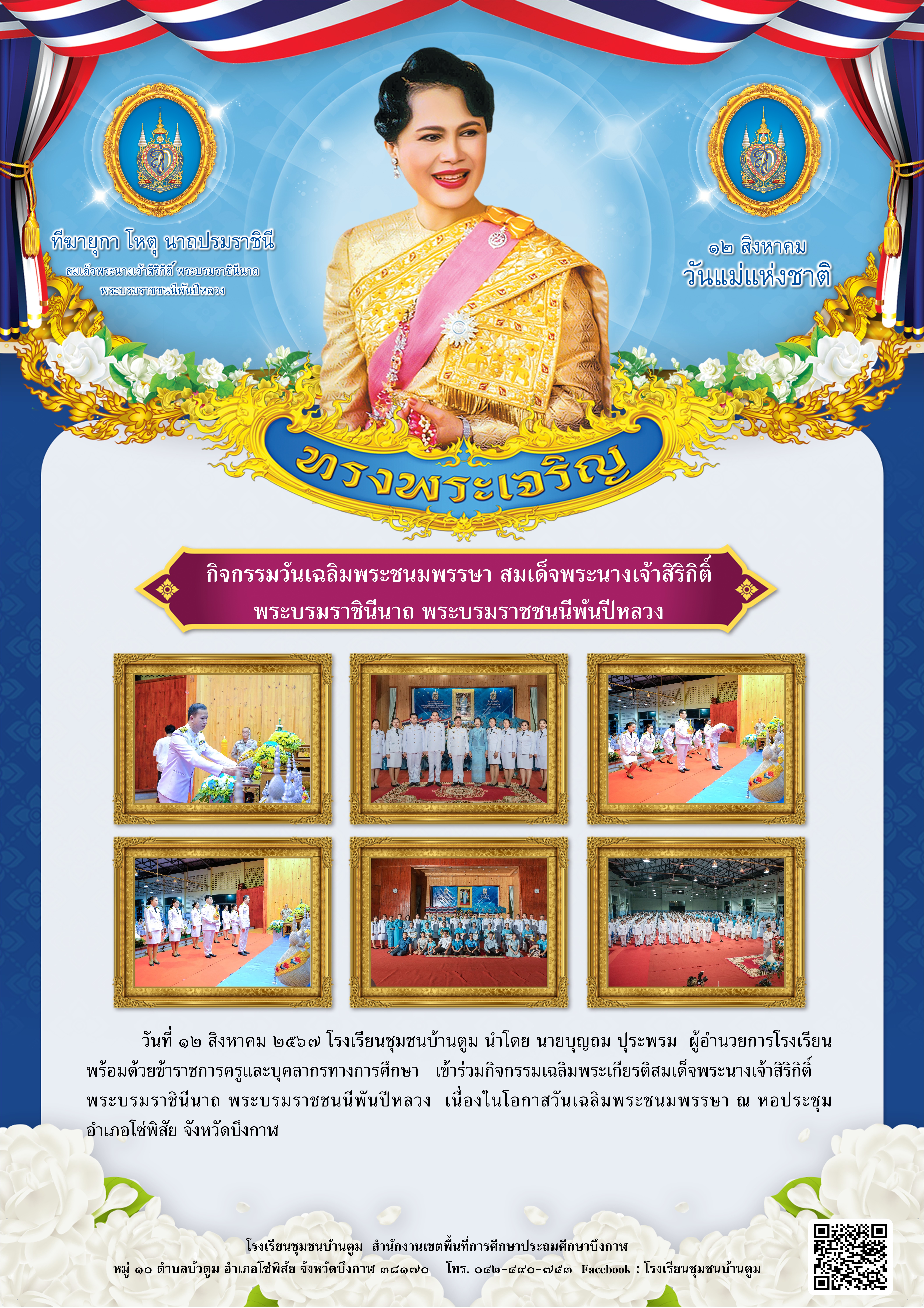 โรงเรียนชุมชนบ้านตูม เข้าร่วมพิธีลงนามถวายพระพรชัยมงคล เนื่องในโอกาสวันเฉลิมพระชนมพรรษา สมเด็จพระนางเจ้าสิริกิติ์ พระบรมราชินีนาถ พระบรมราชชนนีพันปีหลวง ณ หอประชุม อำเภอโซ่พิสัย จังหวัดบึงกาฬ