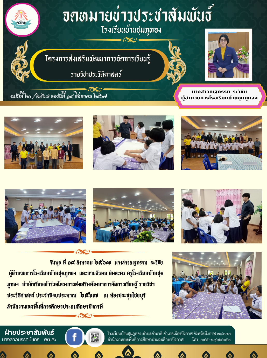วันพุธ ที่ ๑๔ สิงหาคม ๒๕๖๗ นางสาวณฐภรรท ระวิชัย ผู้อำนวยการโรงเรียนบ้านชุมภูทอง และนายธีรพล อินละคร ครูโรงเรียนบ้านชุมภูทอง นำนักเรียนเข้าร่วมโครงการส่งเสริมพัฒนาการจัดการเรียนรู้ รายวิชาประวัติศาสตร์ ประจำปีงบประมาณ ๒๕๖๗ ณ ห้องประชุมไชย