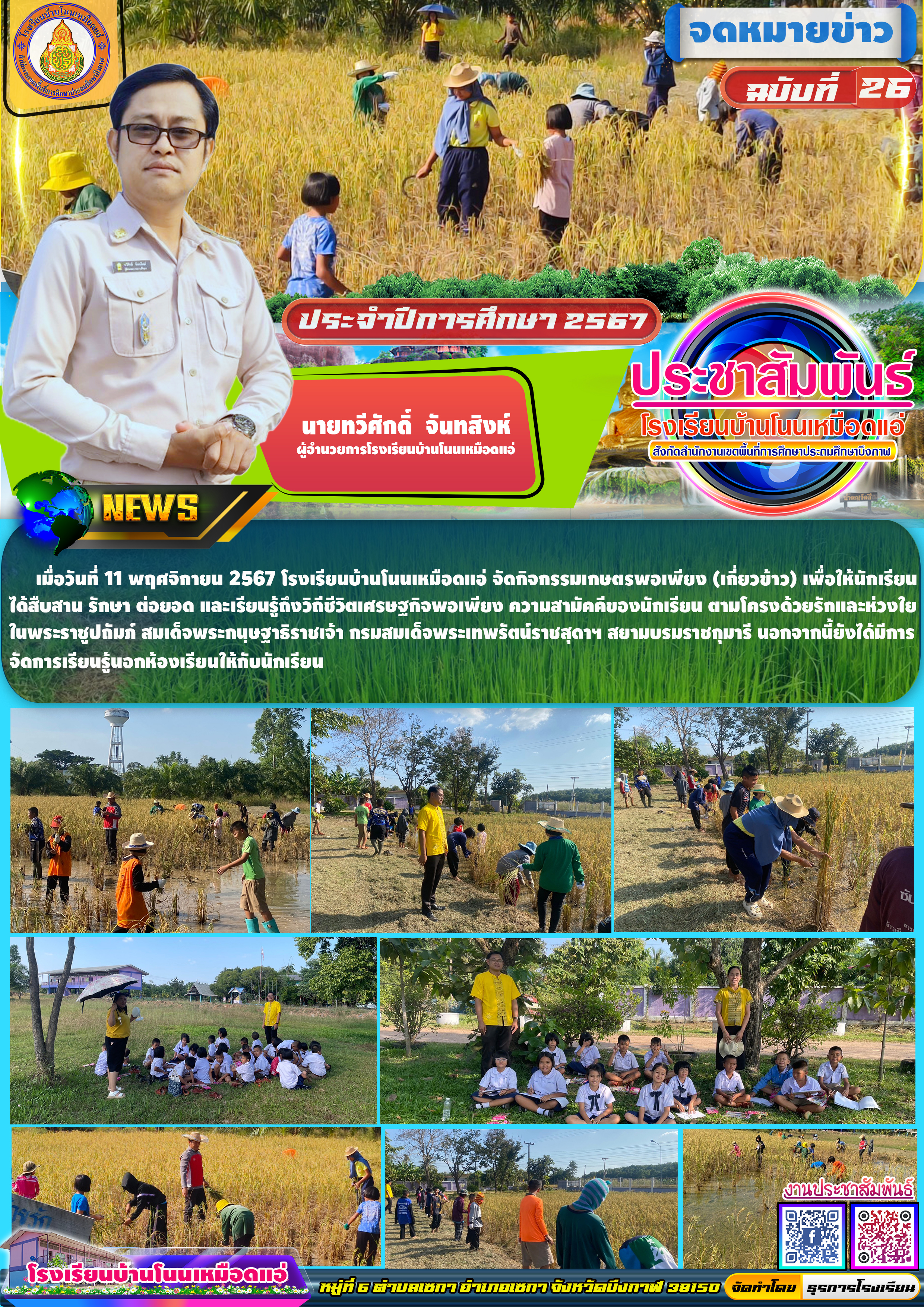 โรงเรียนบ้านโนนเหมือดแอ่ ขอประชาสัมพันธ์จดหมายข่าว ฉบับที่ 26 ปีการศึกษา 2567 กิจกรรมเกษตรพอเพียง (เกี่ยวข้าว)