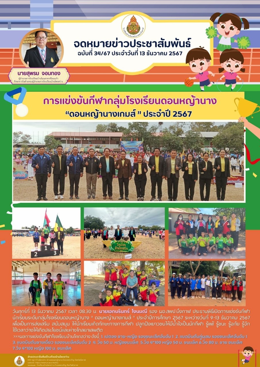 การแข่งขันกีฬากลุ่มโรงเรียนดอนหญ้านาง "ดอนหญ้านางเกมส์" ประจำปี 2567 เมื่อวันศุกร์ที่ 13 ธันวาคม 2567 ณ โรงเรียนบ้านหนองหัวช้าง ผลการแข่งขัน 1. เปตองชาย-หญิง รองชนะเลิศอันดับ 1 2. แบดมินตันคู่ผสม รองชนะเลิศอันดับ 1 3. กรีฑา 50 เมตร หญิงปฐมวัย ชน