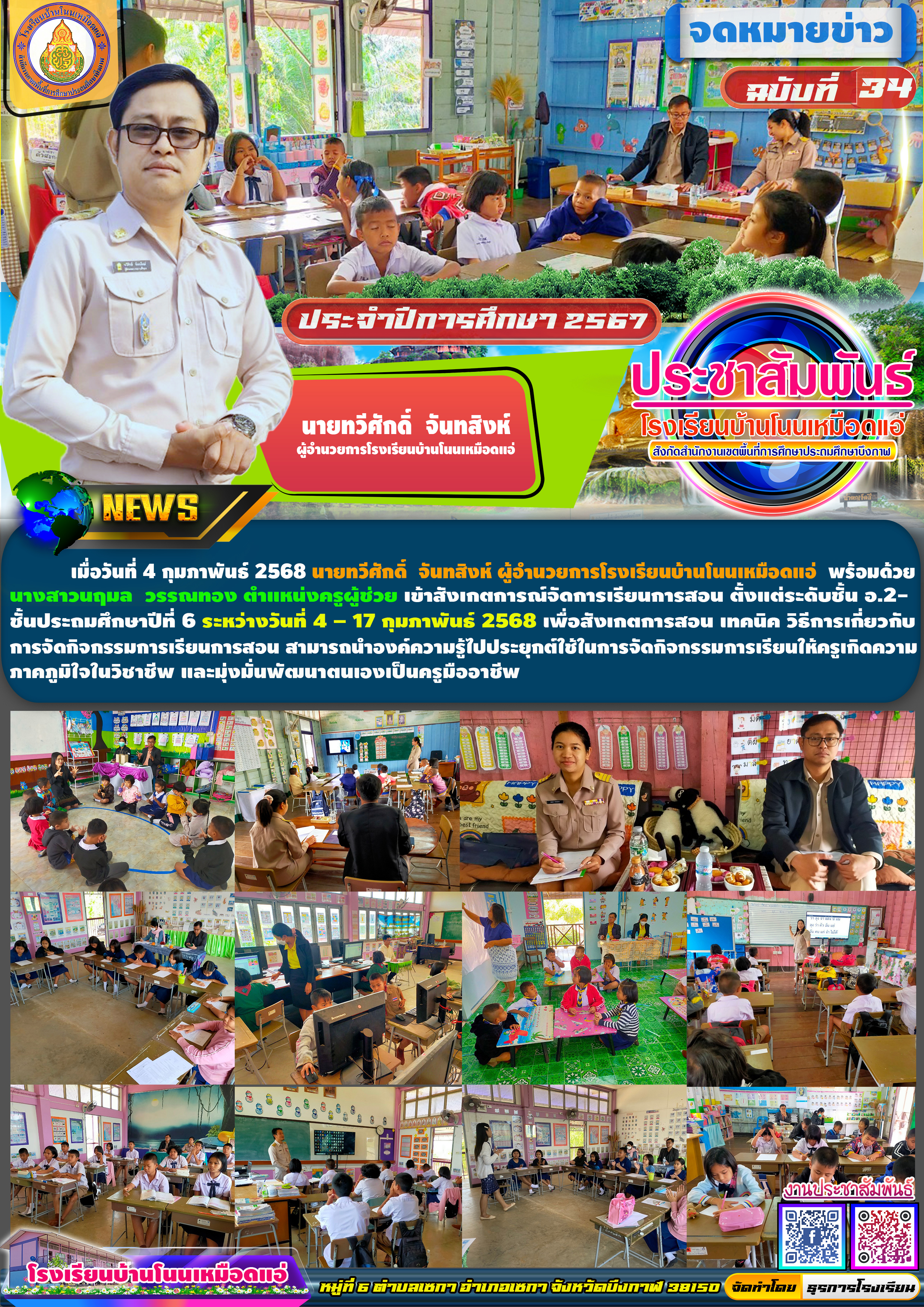 โรงเรียนบ้านโนนเหมือดแอ่ ขอประชาสัมพันธ์จดหมายข่าว ฉบับที่ 34 ปีการศึกษา 2567 นางสาวนฤมล วรรณทอง ตำแหน่งครูผู้ช่วย เข้าสังเกตการณ์จัดการเรียนการสอน ตั้งแต่ระดับชั้น อ.2-ชั้นประถมศึกษาปีที่ 6