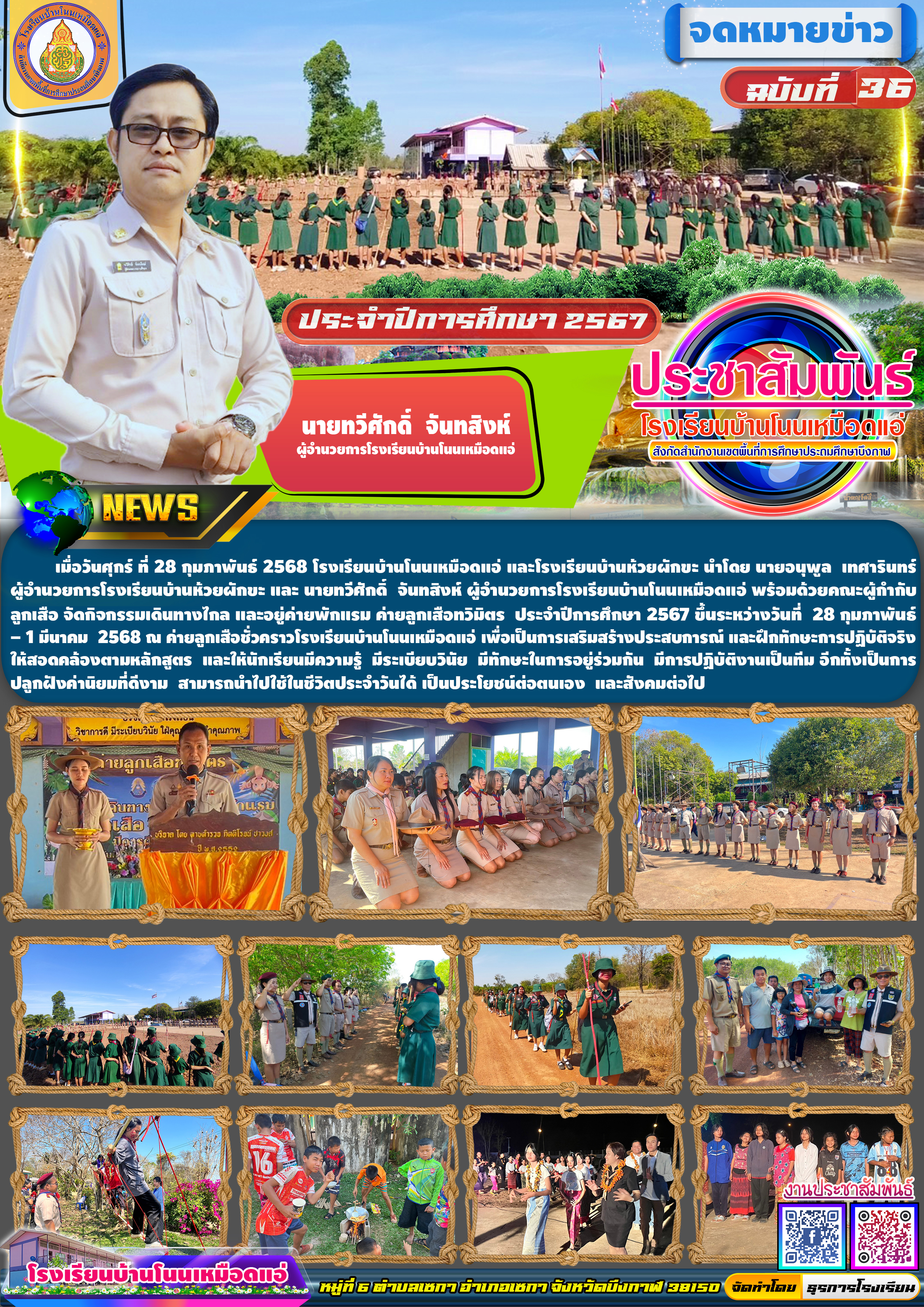 โรงเรียนบ้านโนนเหมือดแอ่ ขอประชาสัมพันธ์จดหมายข่าว ฉบับที่ 36 ปีการศึกษา 2567 กิจกรรมเดินทางไกลและอยู่ค่ายพักแรม ค่ายลูกเสือทวิมิตร ประจำปีการศึกษา 2567