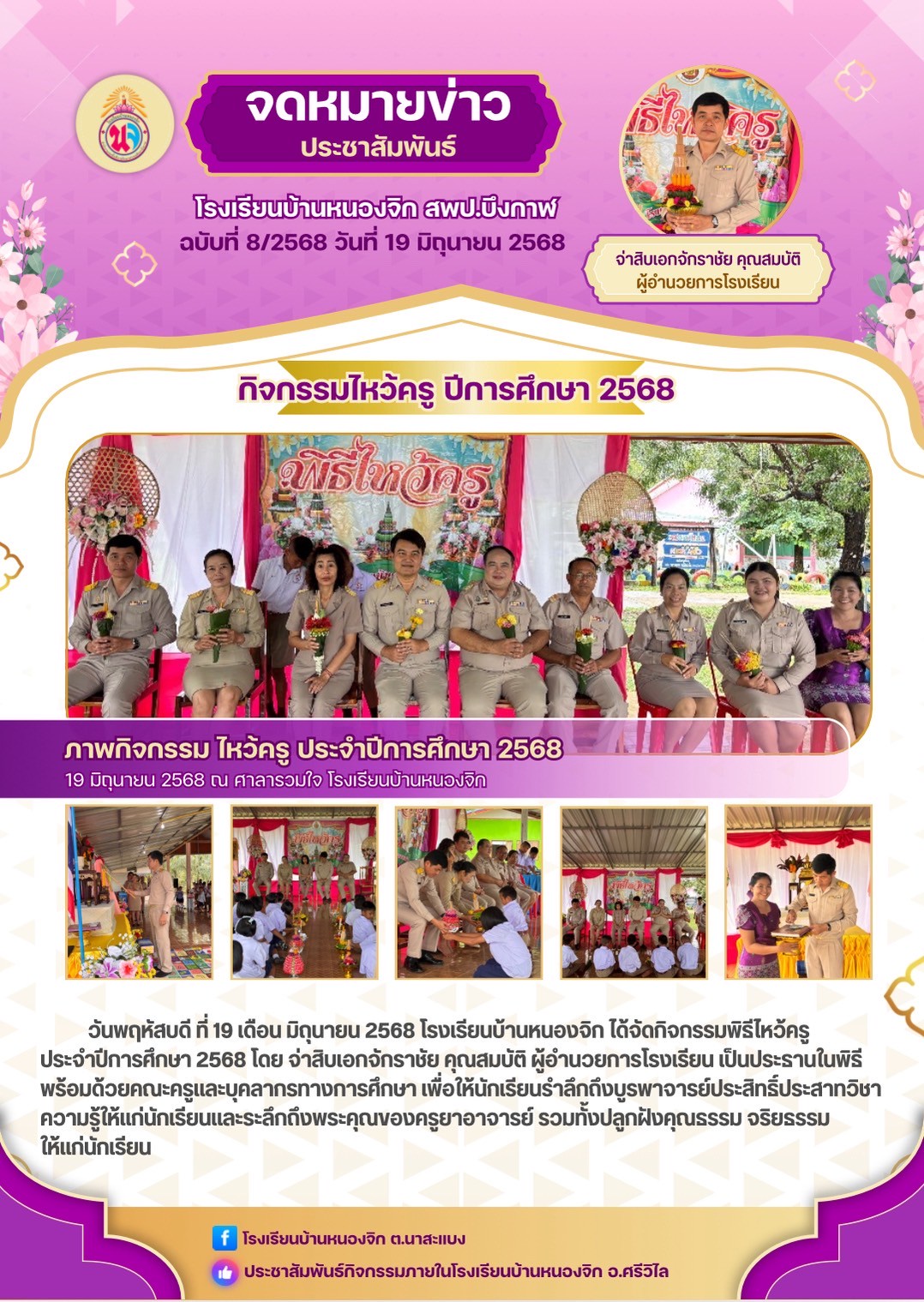 ![]() | กิจกรรมไหว้ครู 68(เผยแพร่เมื่อวันที่ 21 มิย 2568 20:48:29 น.) ผู้รายงาน : ธุรการโรงเรียน บ้านหนองจิก |