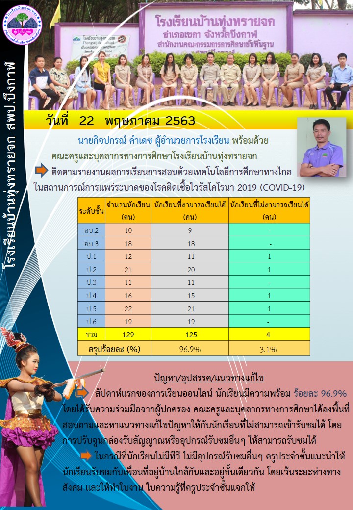 โรงเรียนบ้านทุ่งทรายจก ประชาสัมพันธ์-รายงานการติดตามการเรียนการทางไกล ในสถานการณ์แพร่ระบาดโรคติดเชื้อไวรัสโคโรน่า 2019 (COVID -19) สัปดาห์ที่ 1 วันที่ 22 พฤษภาคม 2563
