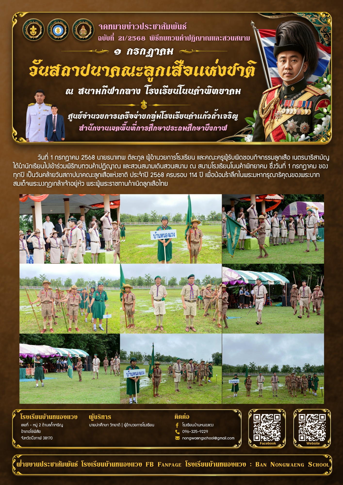 โรงเรียนบ้านหนองแวง ขอประชาสัมพันธ์จดหมายข่าว ฉบับที่ 21 ปีการศึกษา 2568 กิจกรรมวันพิธีทบทวนคำปฏิญาณและสวนสนาม เนื่องในวันคล้ายวันสถาปนาลูกเสือแห่งชาติ ประจำปี 2568
