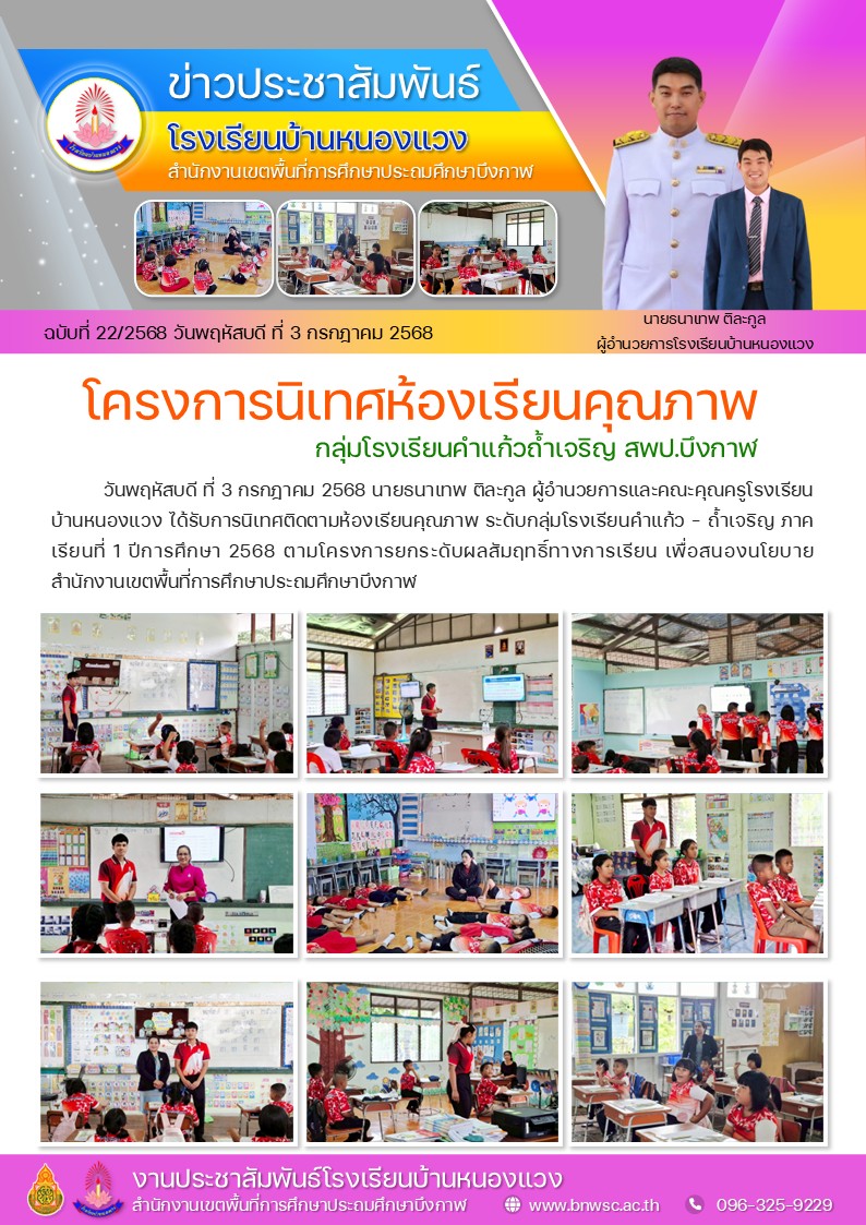 โรงเรียนบ้านหนองแวง ขอประชาสัมพันธ์จดหมายข่าว ฉบับที่ 22/2568 การนิเทศติดตามห้องเรียนคุณภาพ กลุ่มโรงเรียนคำแก้ว - ถ้ำเจริญ ภาคเรียนที่ 1 ปีการศึกษา 2568
