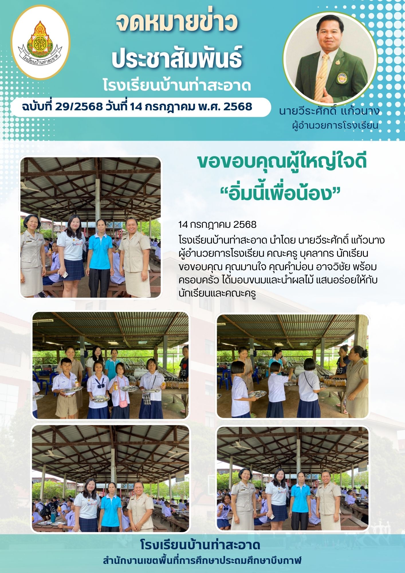 โรงเรียนบ้านท่าสะอาด นำโดย นายวีระศักดิ์ แก้วนาง ผู้อำนวยการโรงเรียน คณะครู บุคลากร นักเรียน ขอขอบคุณ คุณมานใจ คุณคำม่อน อาจวิชัย พร้อมครอบครัว ได้มอบขนมและนำ้ผลไม้ แสนอร่อยให้กับนักเรียนและคณะครู