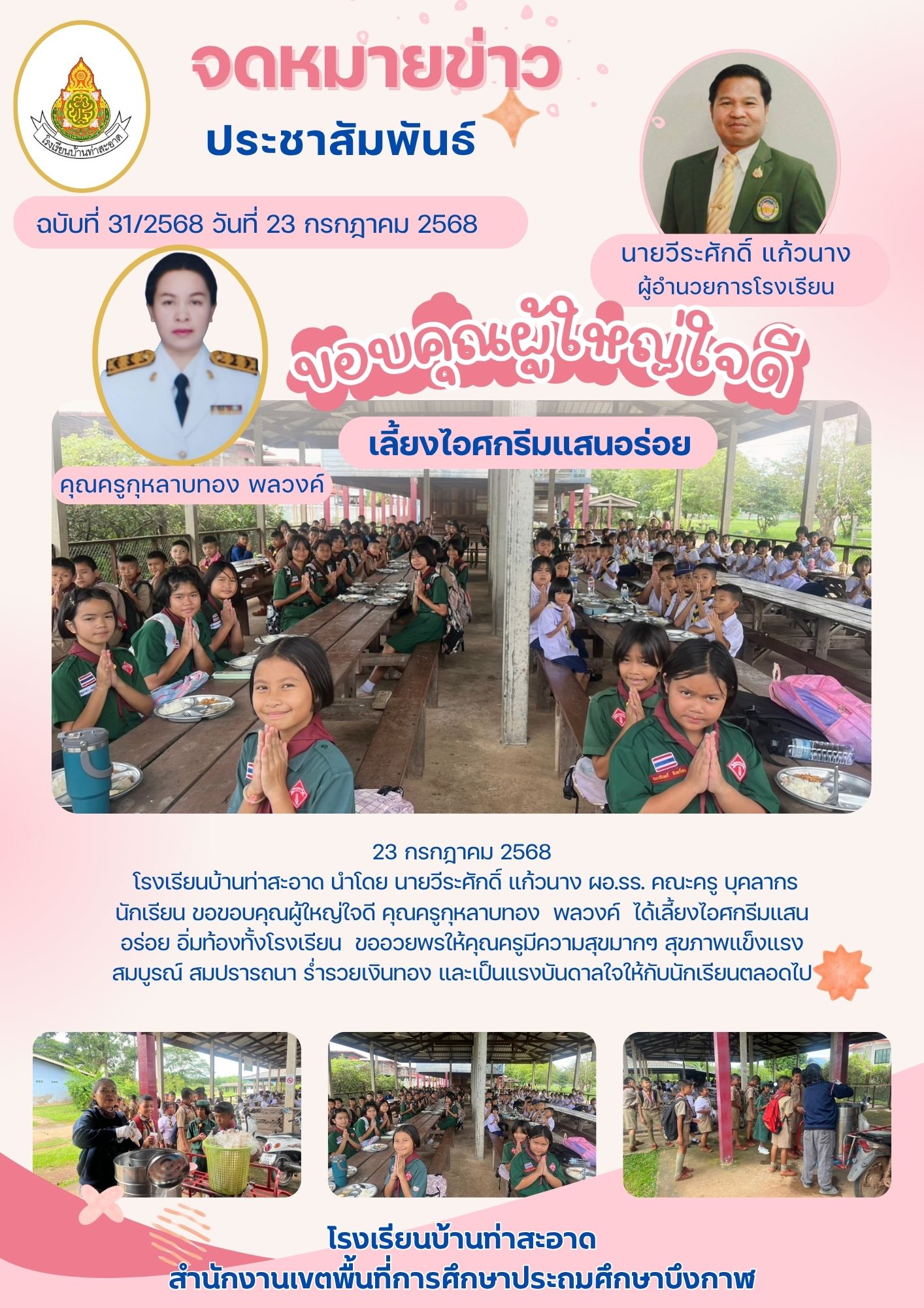 โรงเรียนบ้านท่าสะอาด ขอบคุณผู้ใหญ่ใจดี เลี้ยงไออศกรีมแสนอร่อย น้องๆอิ่มท้อง ผู้ใหญ่อิ่มบุญ