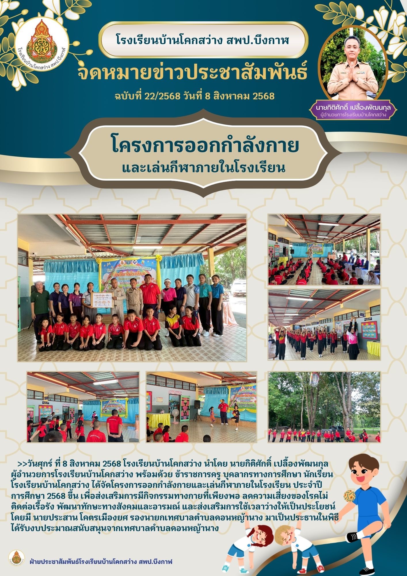 โรงเรียนบ้านโคกสว่าง ฉบับที่ 22/2568 จัดกิจกรรมตามโครงการส่งเสริมการออกกำลังกายและเล่นกีฬาในโรงเรียน ได้รับงบประมาณสนับสนุนจากกองทุนหลักประกันสุขภาพ เทศบาลตำบลดอนหญ้านาง เมื่อวันที่ 8 สิงหาคม 2568