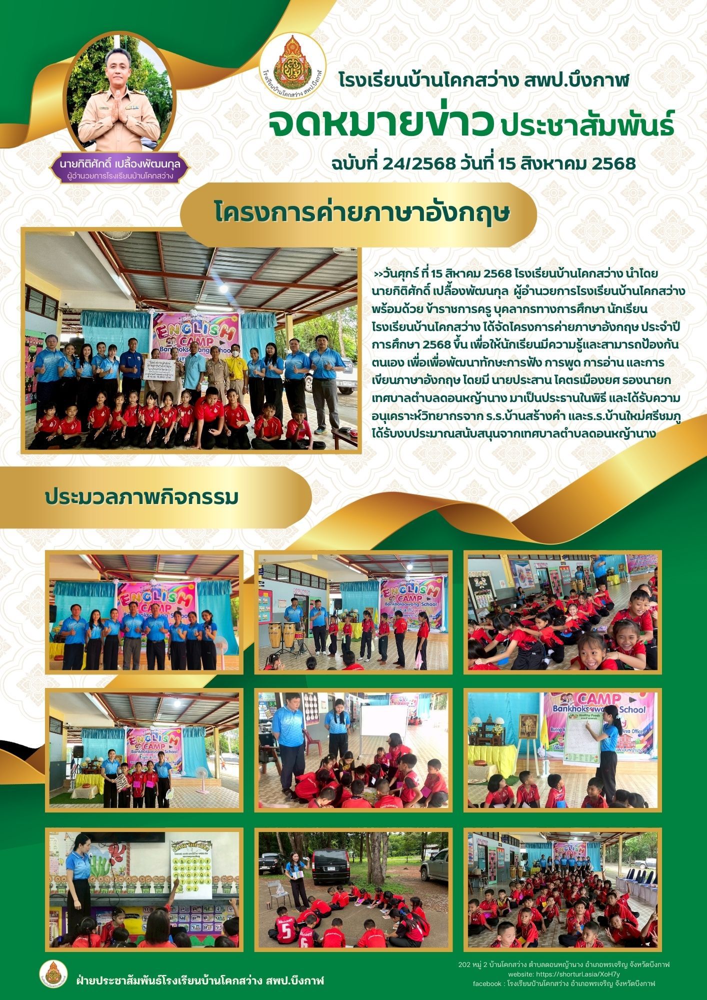 โรงเรียนบ้านโคกสว่าง ฉบับที่ 24/2568 จัดกิจกรรมตามโครงการค่ายอบรมภาษาอังกฤษ ได้รับงบประมาณสนับสนุนจากเทศบาลตำบลดอนหญ้านาง เมื่อวันที่ 15 สิงหาคม 2568