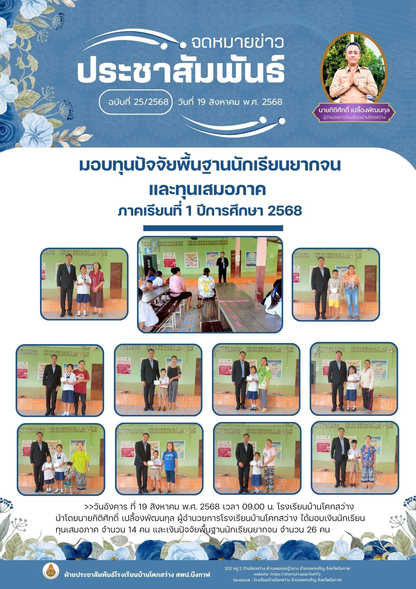โรงเรียนบ้านโคกสว่าง ฉบับที่ 25/2568 จัดกิจกรรมมอบเงินทุนนักเรียนเสมอภาคและเงินปัจจัยพื้นฐานนักเรียนยากจน ภาคเรียนที่ 1 ปีการศึกษา 2568 กลุ่มต่อเนื่อง เมื่อวันที่ 19 สิงหาคม 2568