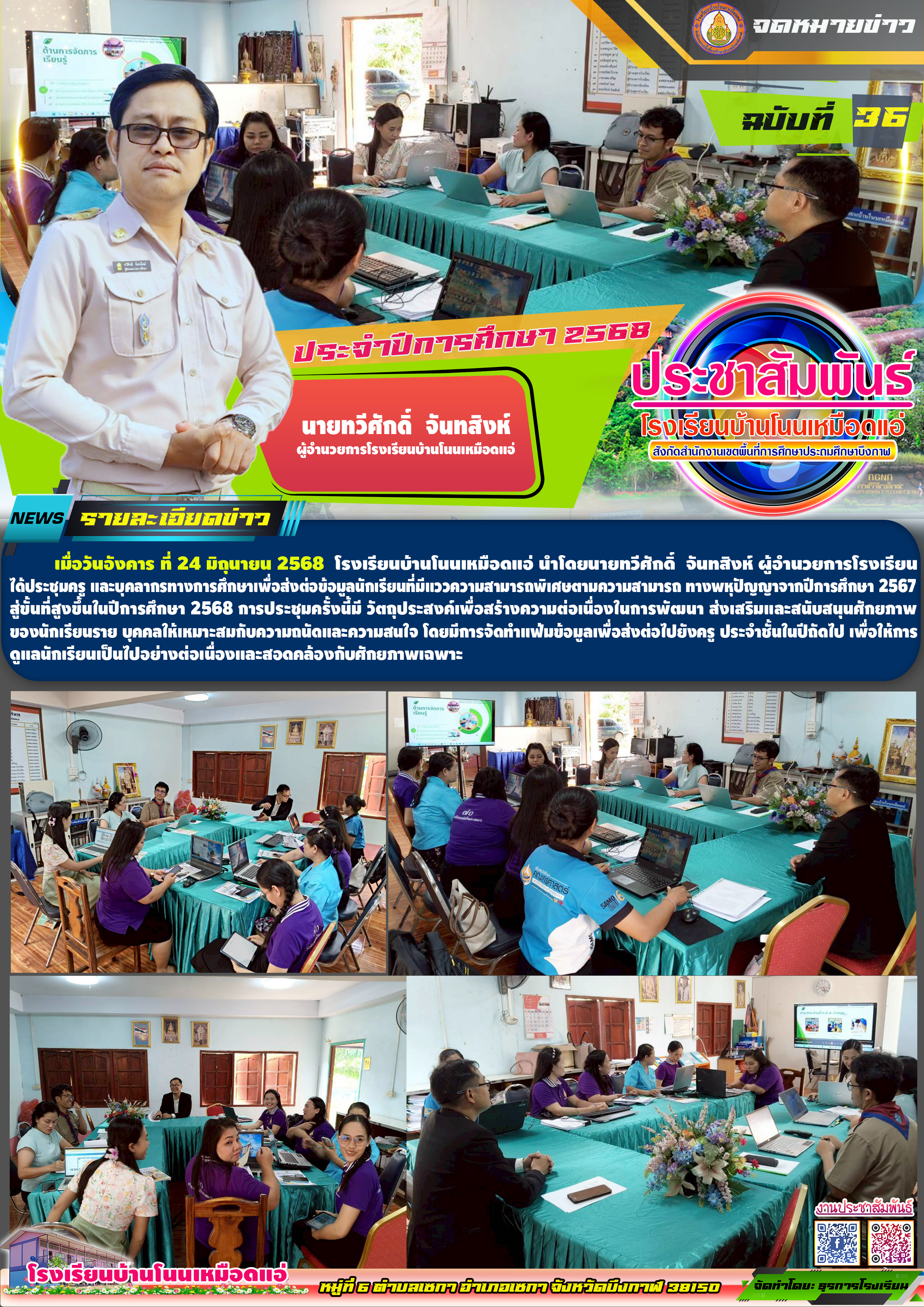 โรงเรียนบ้านโนนเหมือดแอ่ ขอประชาสัมพันธ์จดหมายข่าว ฉบับที่ 36 ปีการศึกษา 2568 ประชุมครู และบุคลากรทางการศึกษาเพื่อส่งต่อข้อมูลนักเรียนที่มีแววความสามารถพิเศษตามความสามารถ ทางพหุปัญญาจากปีการศึกษา 2567 สู่ขั้นที่สูงขึ้นในปีการศึกษา 2568
